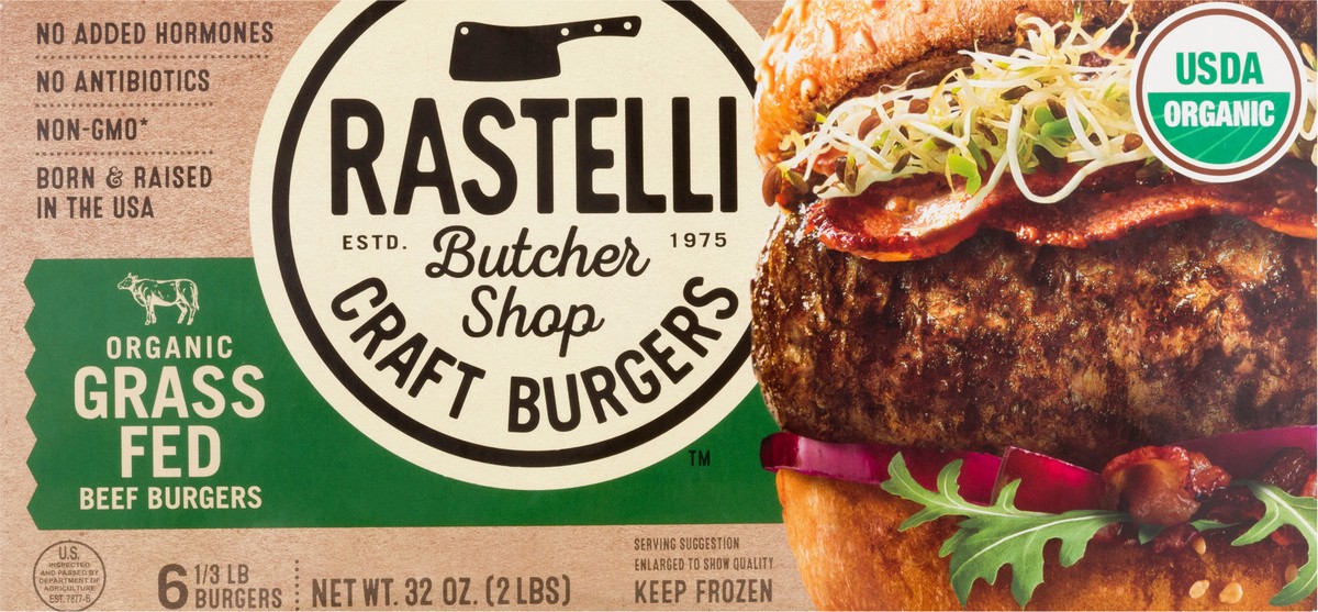 Organic grass fed beef burgers. USDA Organic. Certified Organic by CCOF. No added hormones. No antibiotics. Non-GMO. Estd 1975. Our Story: We are proud to introduce Rastelli Butcher Shop Craft Burgers…