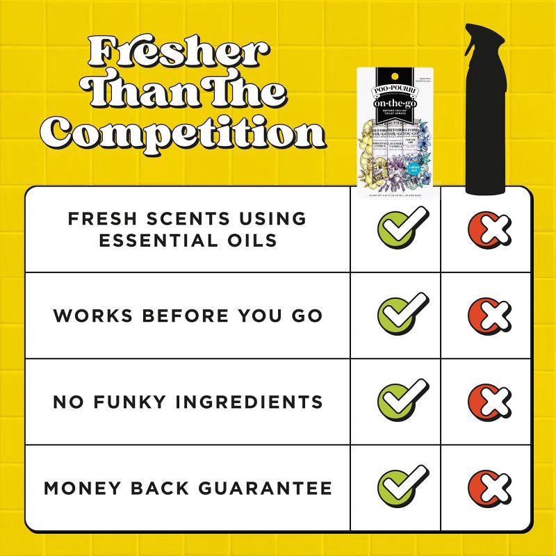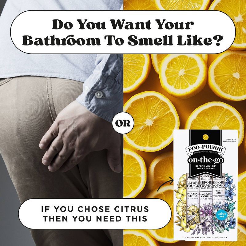 Take the most popular Poo~Pourri scents with you wherever you GO with Poo~Pourri's On-The-Go 3-Pack. This set comes with travel sizes of Original Citrus: a bright citrus scent balanced with fresh bota…