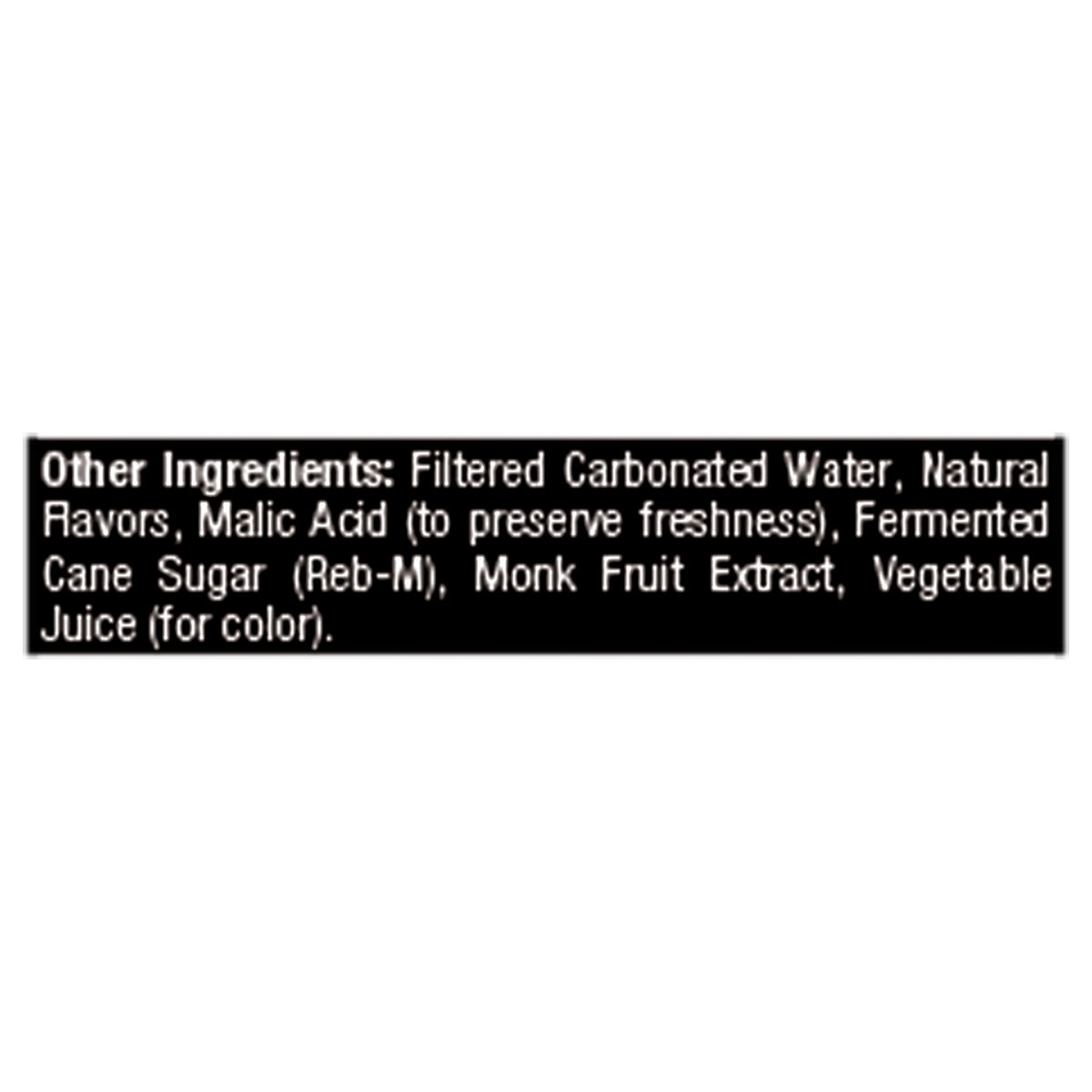 Other Ingredients: Filtered Carbonated Water, Natural Flavors, Malic Acid (to Preserve Freshness), Fermented Cane Sugar (Reb-M), Monk Fruit Extract, Vegetable Juice (for Color).