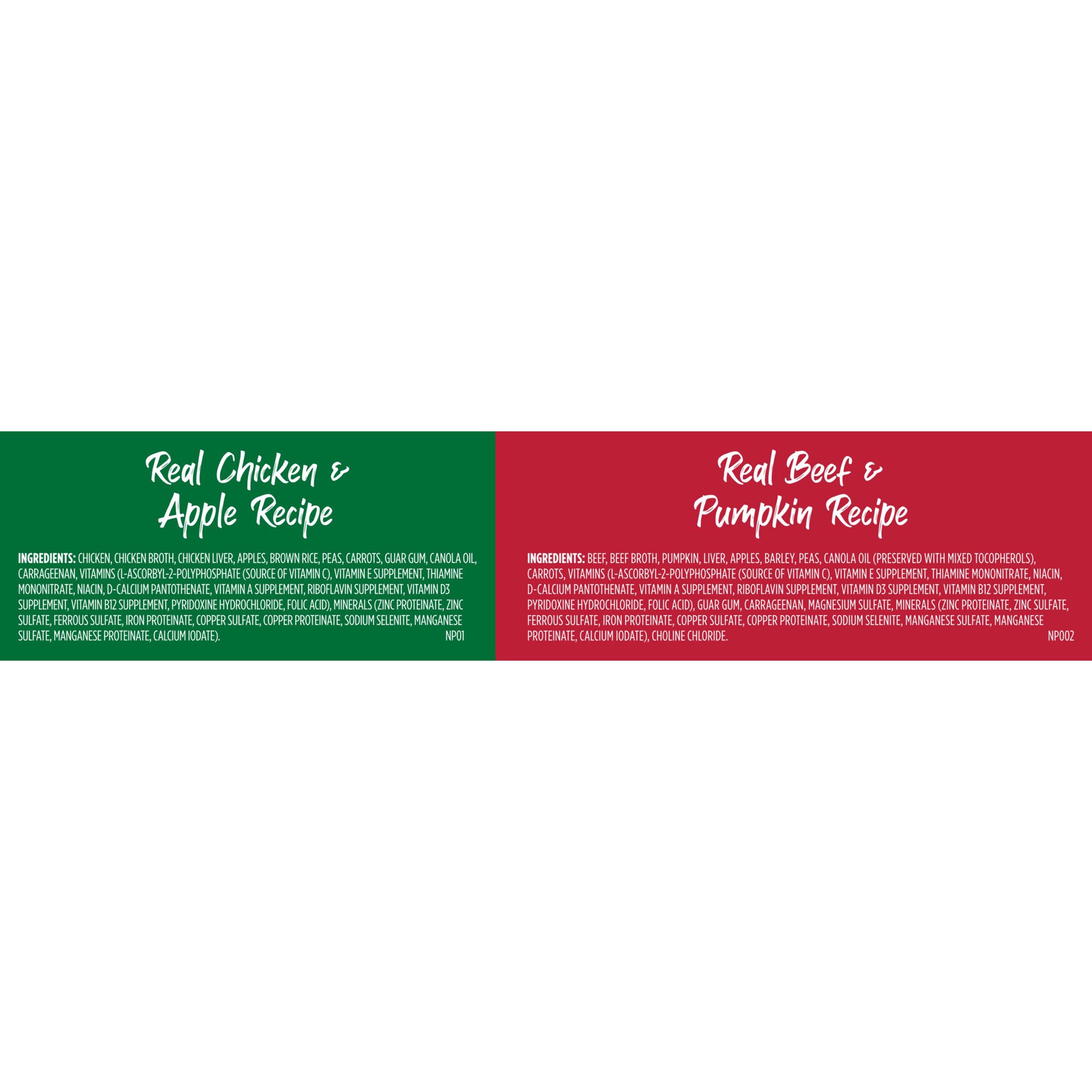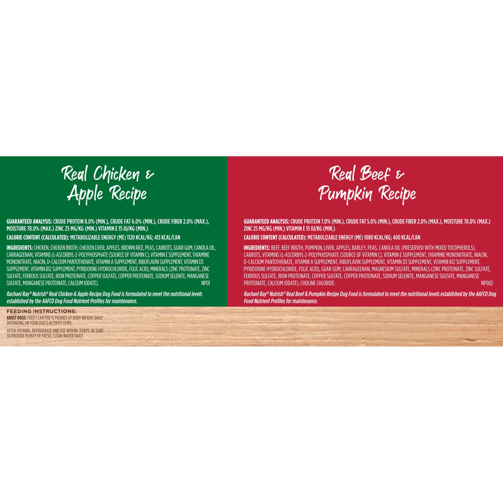 - Contains twelve (12) 13-ounce cans of wet dog food: six (6) Real Chicken & Apple Recipe and six (6) Real Beef & Pumpkin Recipe