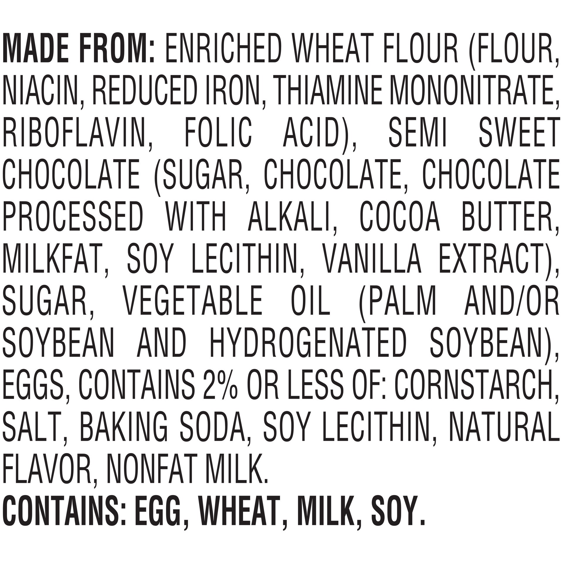 MADE FROM: ENRICHED WHEAT FLOUR (FLOUR, NIACIN, REDUCED IRON, THIAMINE MONONITRATE, RIBOFLAVIN, FOLIC ACID), SEMI SWEET CHOCOLATE (SUGAR, CHOCOLATE, CHOCOLATE PROCESSED WITH ALKALI, COCOA BUTTER, MILK…