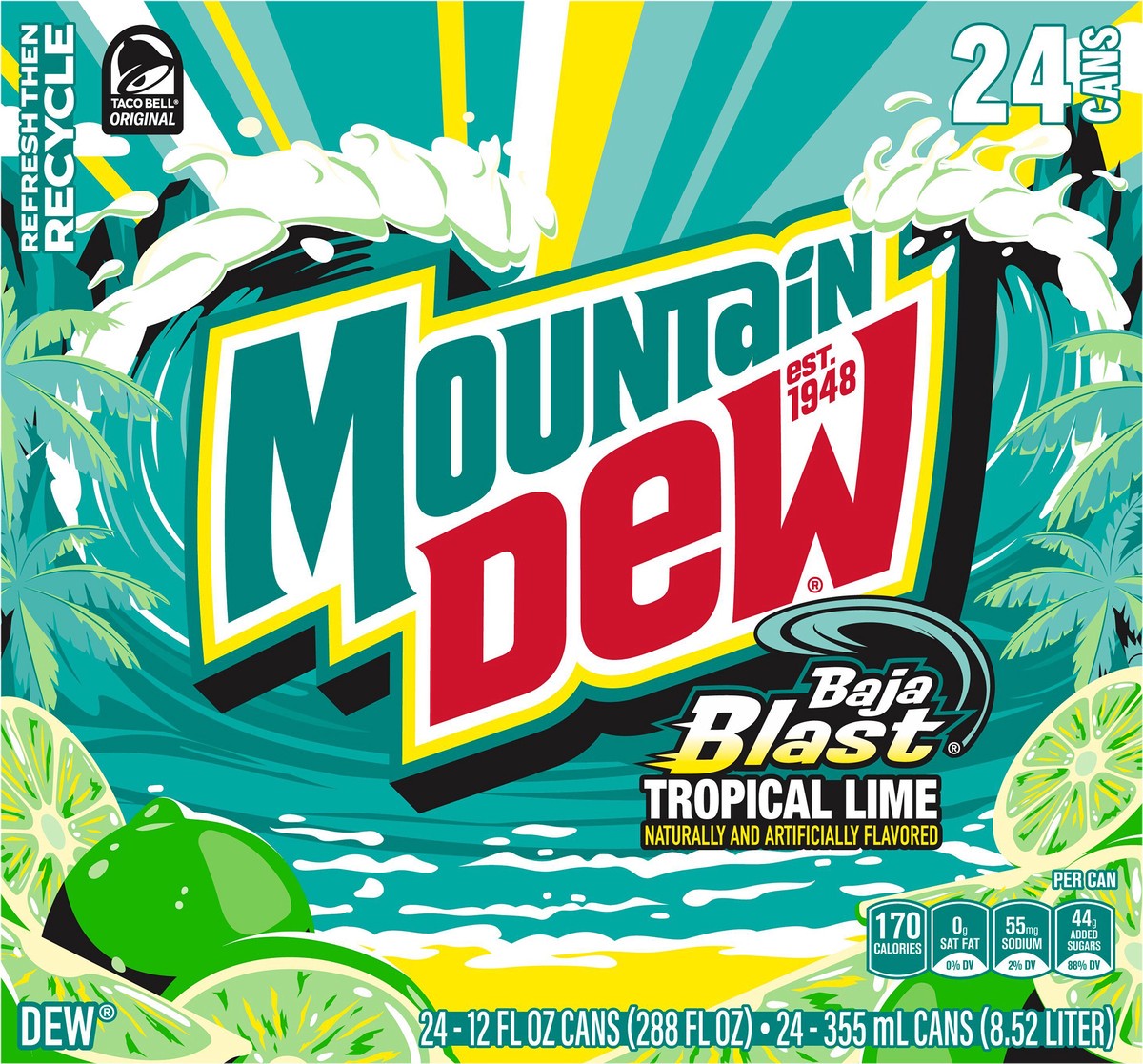For a limited time we're bringing back the bold, tropical lime flavor of Mtn Dew Baja Blast plus a new offering - Mtn Dew Baja Blast Zero Sugar, for the refreshing escape of Baja without the sugar.
