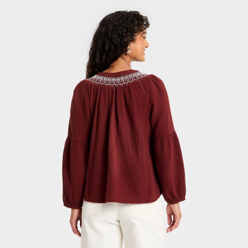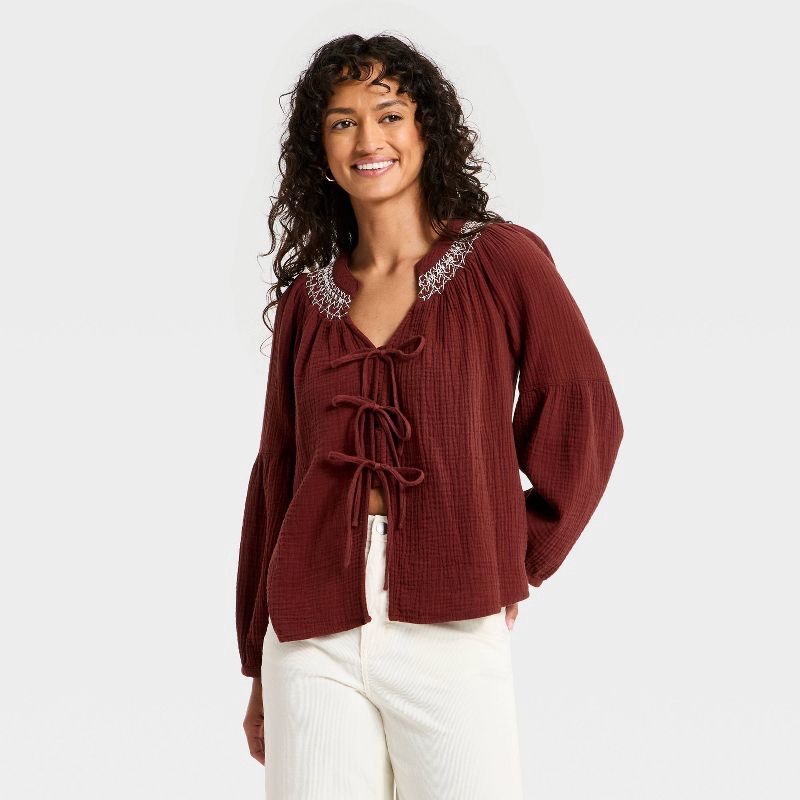 Whether you're dressing for a coffee date or a laid-back gathering, this Raglan Long-Sleeve Tie-Front Blouse from Universal Thread™ is a perfect pick. Made of 100% cotton with smocked detailing, this …