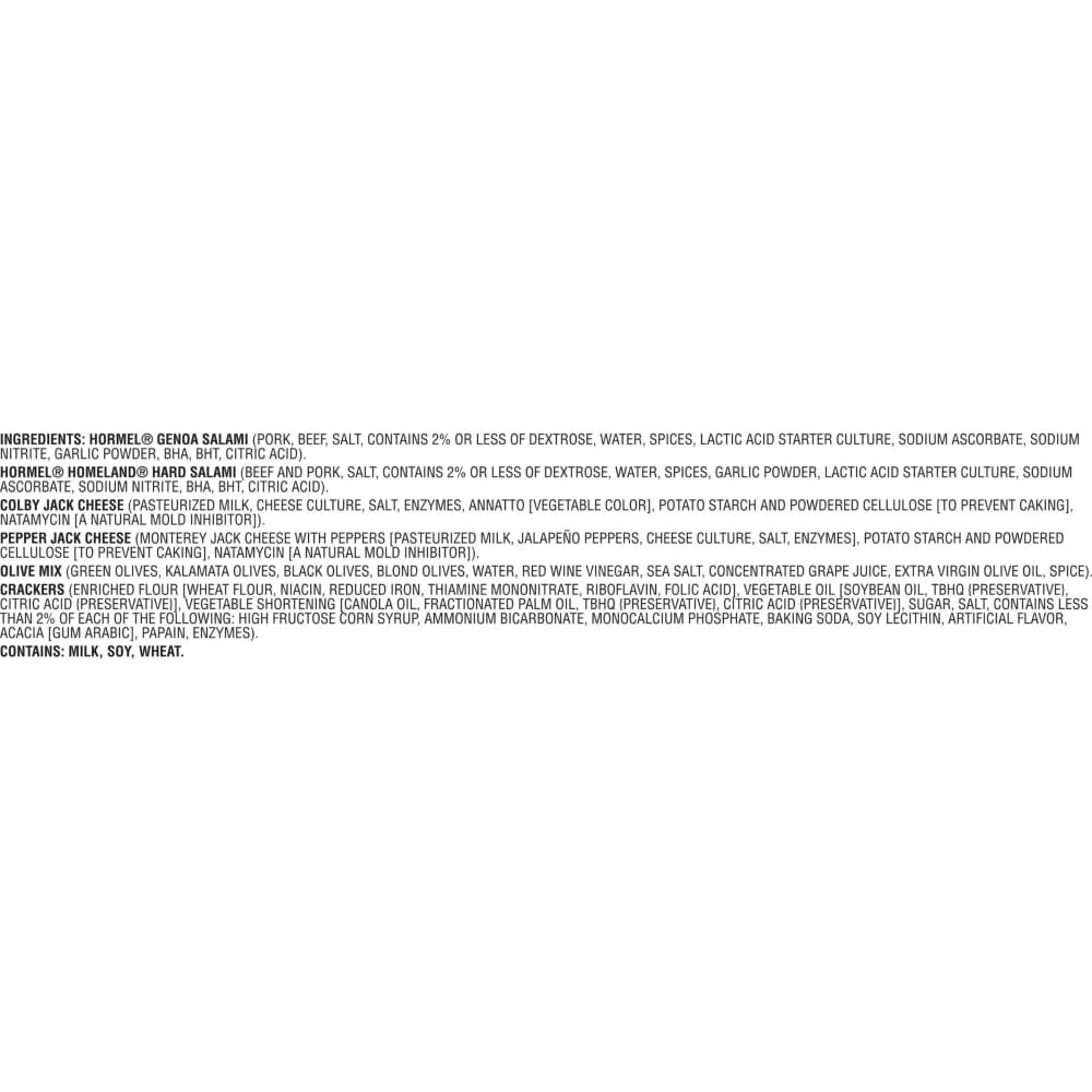 Hormel Hard Salami - BHA, BHT with citric acid added to help protect flavor. Sargento Colby Jack Cheese. Hormel Genoa Salami - BHA, BHT with citric acid added to help protect flavor. Sargento Pepper J…