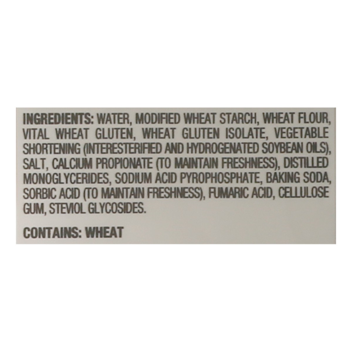 Water, Modified Wheat Starch, Wheat Flour, Vital Wheat Gluten, Wheat Gluten Isolate, Vegetable Shortening (Interesterified And Hydrogenated Soybean Oils), Salt, Calcium Propionate (To Maintain Freshne…