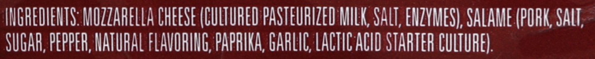 Mozzarella Cheese (Cultured Pasteurized Milk, Salt, Enzymes), Salame (Pork, Salt, Sugar, Pepper, Natural Flavoring, Paprika, Garlic, Lactic Acid Starter Culture).