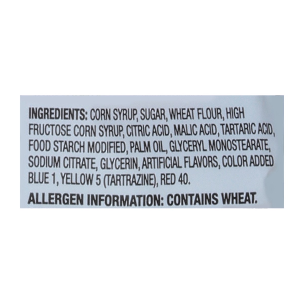 Corn Syrup, Sugar, Wheat Flour, High Fructose Corn Syrup, Citric Acid, Malic Acid, Tartaric Acid, Food Starch Modified, Palm Oil, Glyceryl Monostearate, Sodium Citrate, Glycerin, Artificial Flavors, C…