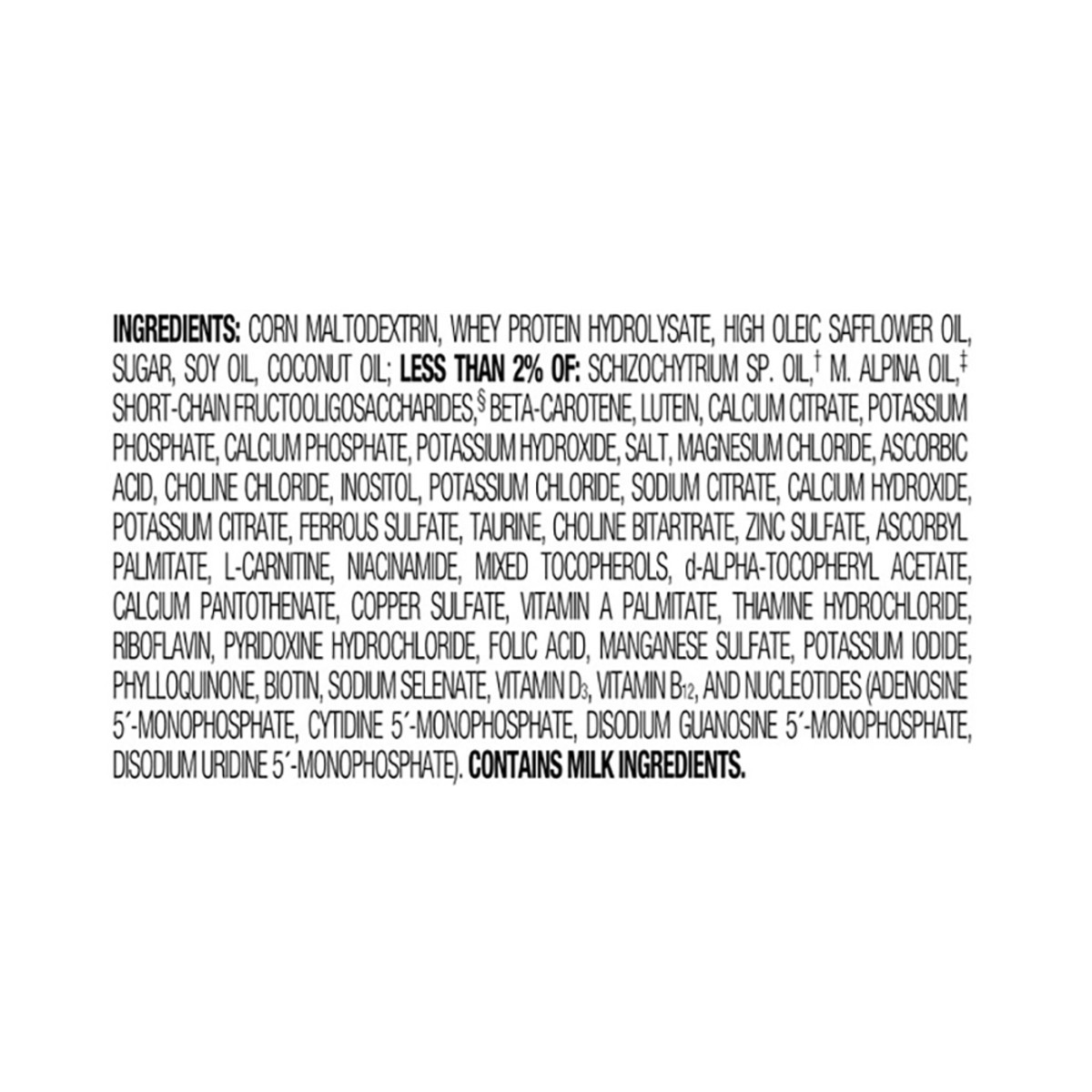 Corn Maltodextrin, Whey Protein Hydrolysate, High Oleic Safflower Oil, Sugar, Soy Oil, Coconut Oil; Less than 2% of: Schizochytrum SP, Oil (Source of DHA), M, Alpina Oil (Source of ARA), Short-Chain F…