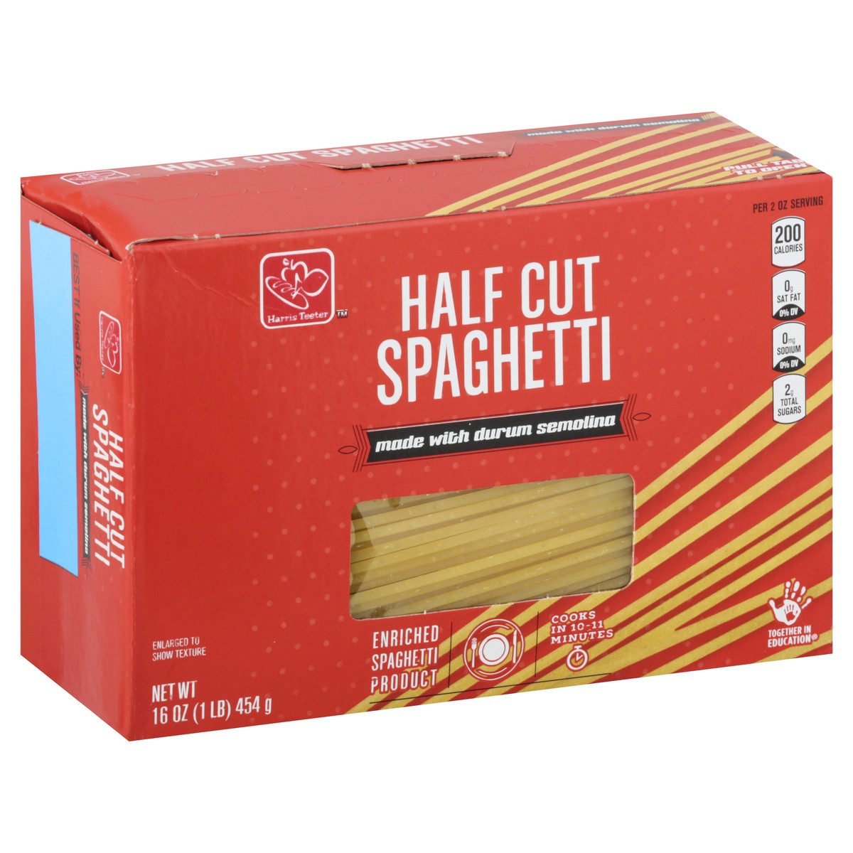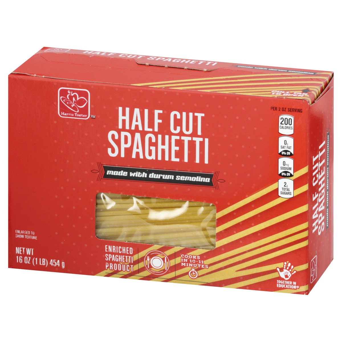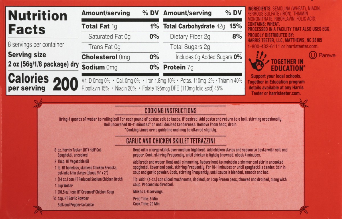 Enriched spaghetti product. Per 2 oz Serving: 200 calories; 0 g sat fat (0% DV); 0 mg sodium (0% DV); 2 g total sugars. Made with durum semolina. harristeeter.com. Together in Education: Support your …