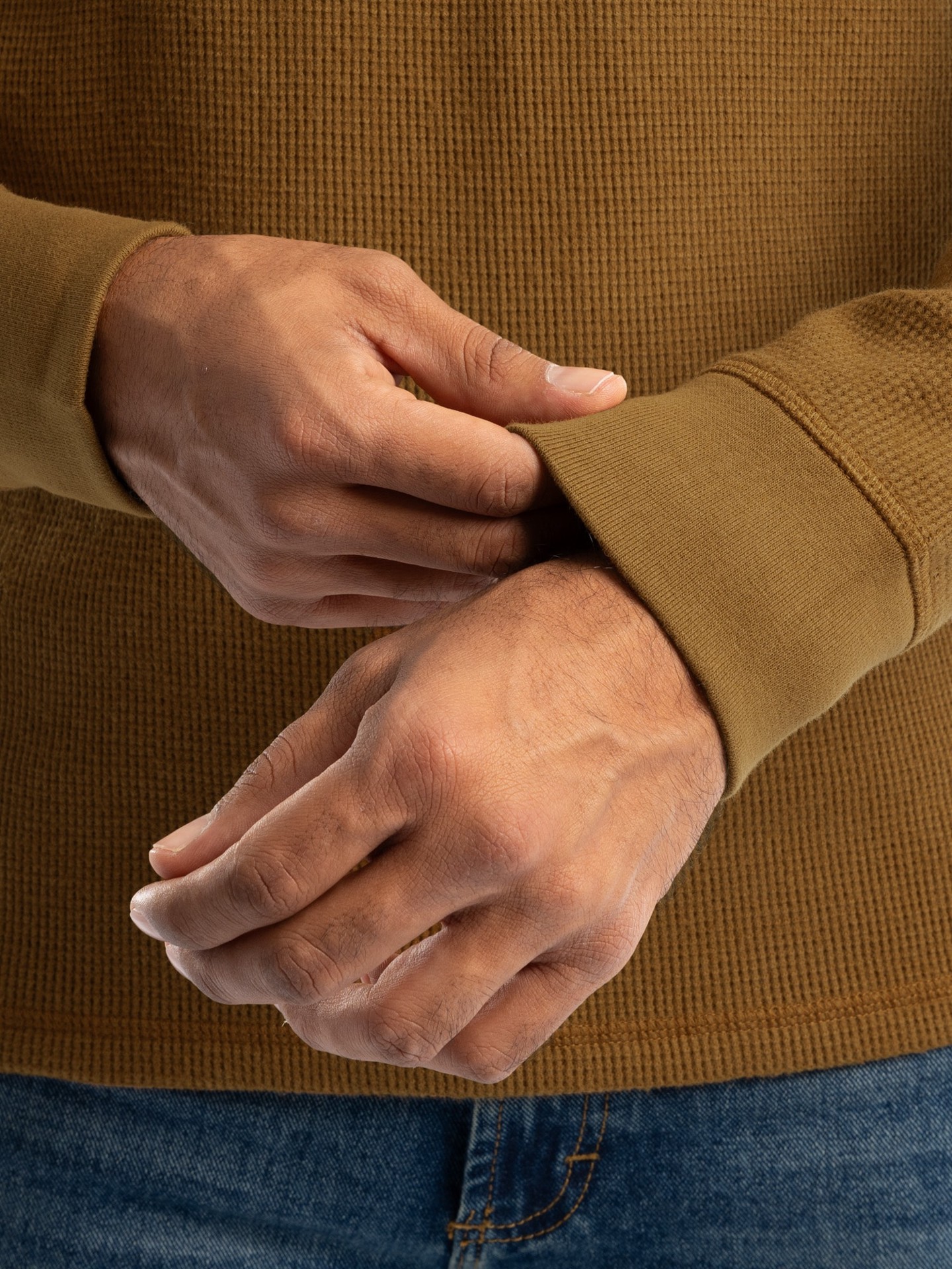Drawstring for Better Fitting Hood. Brushed Thermal Waffle. Henley with two Buttoms.