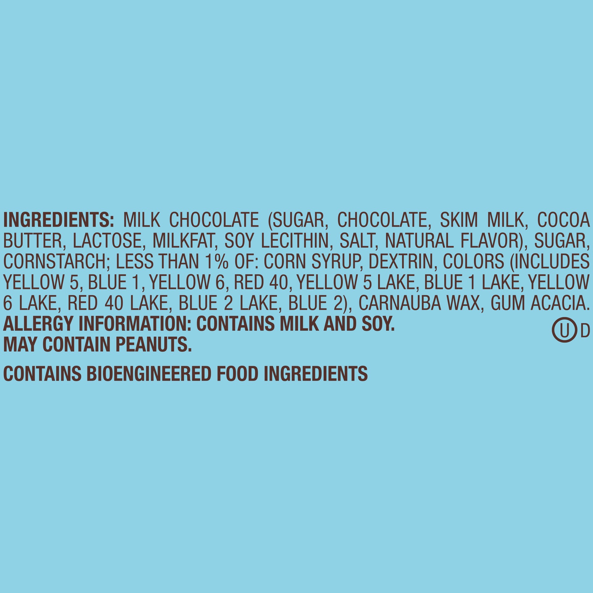 Milk Chocolate (Sugar, Chocolate, Skim Milk, Cocoa Butter, Lactose, Milkfat, Soy Lecithin, Salt, Artificial and Natural Flavors), Sugar, Cornstarch, Less than 1% - Corn Syrup, Dextrin, Coloring (Inclu…