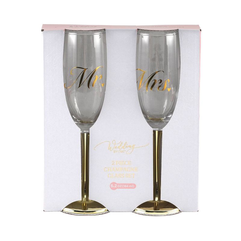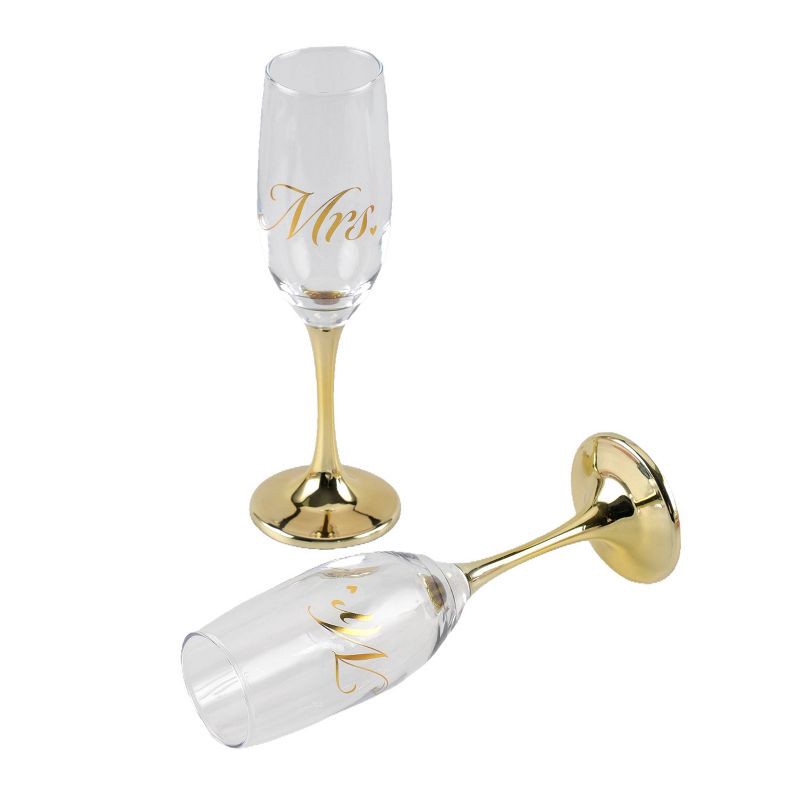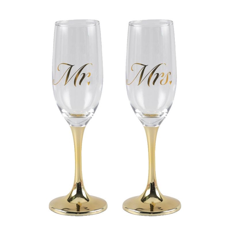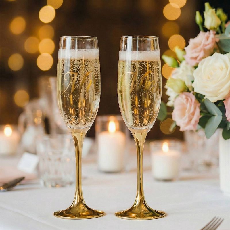 - Elegant Mr. & Mrs. Design – Features matching champagne flutes with stylish gold script “Mr.” and “Mrs.” lettering, each accented with a delicate heart detail.