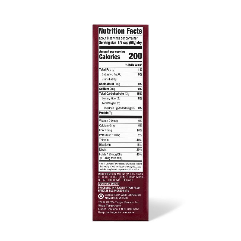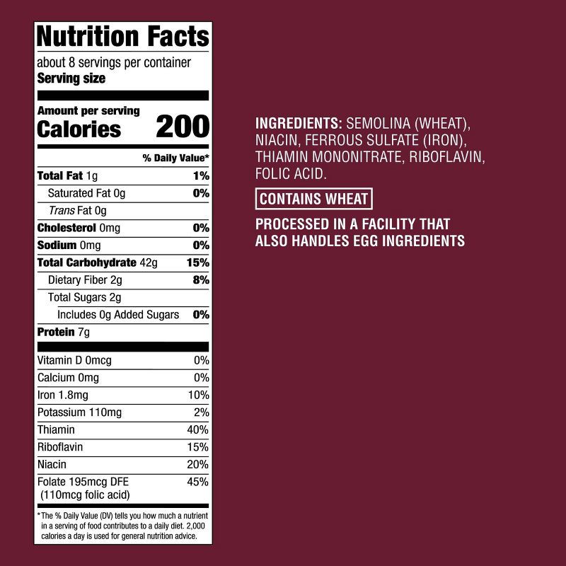SEMOLINA (WHEAT), NIACIN, FERROUS SULFATE (IRON), THIAMIN MONO- NITRATE, RIBOFLAVIN, FOLIC ACID.