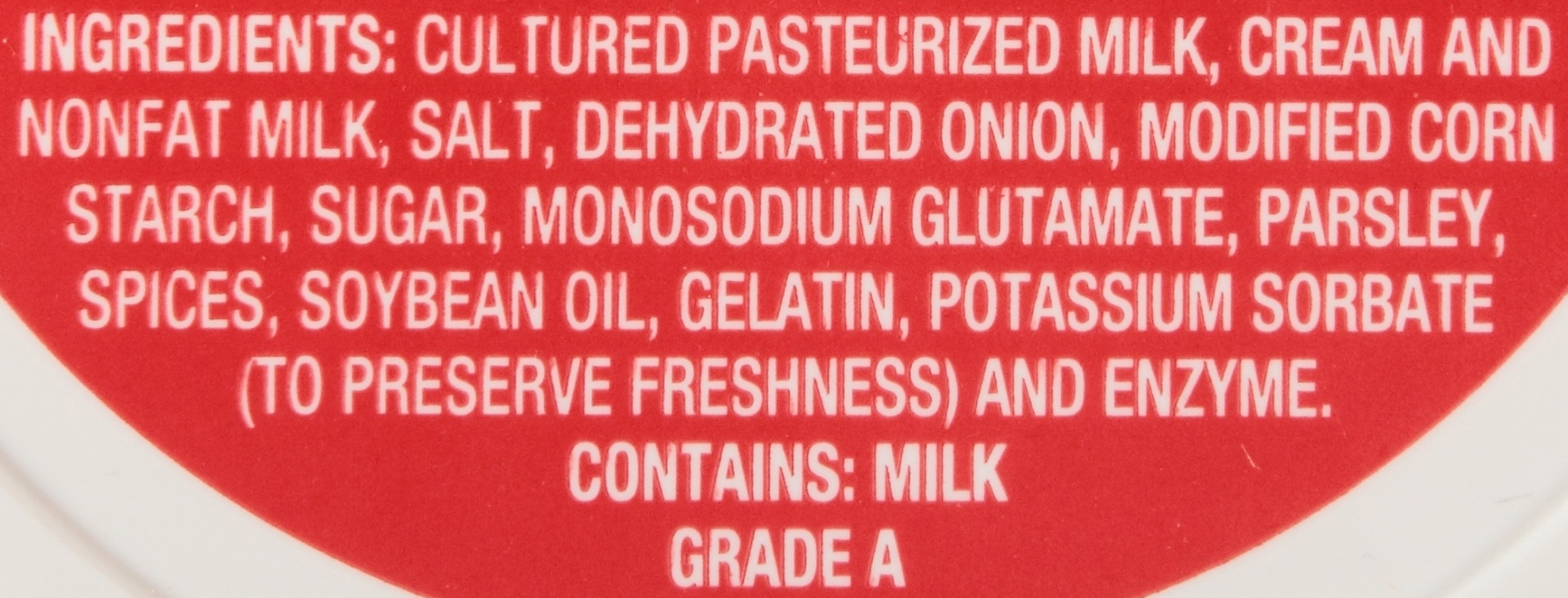 Cultured Pasteurized Milk, Cream and Nonfat Milk, Salt, Dehydrated Onion, Modified Corn Starch, Sugar (Adds a Trivial Amount of Added Sugar), Monosodium Glutamate, Parsley, Spices, Gelatin, Potassium …