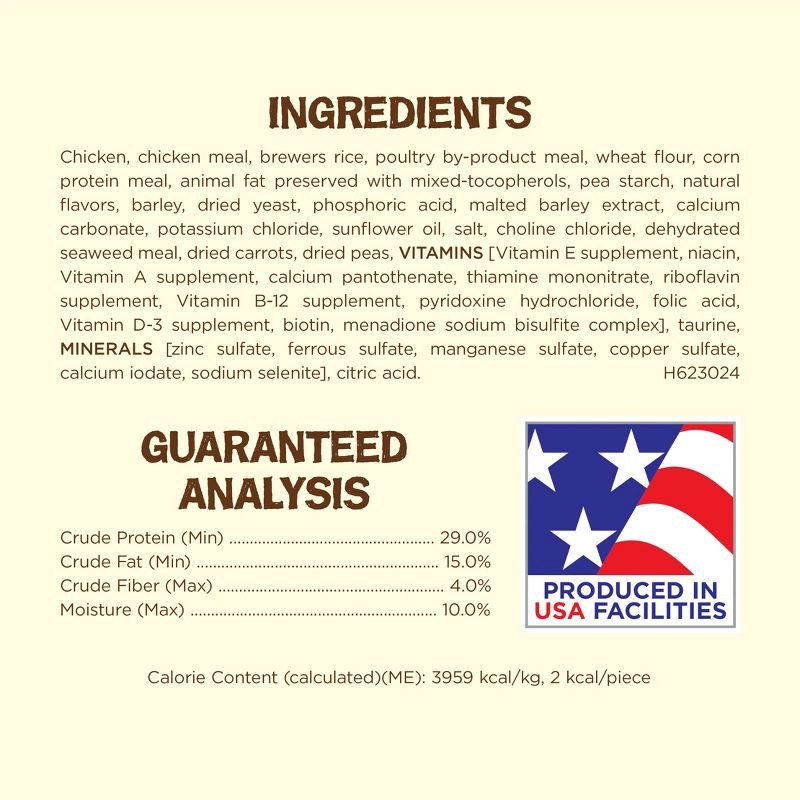 Chicken, chicken meal, brewers rice, poultry by-product meal, wheat flour, corn protein meal, animal fat preserved with mixed-tocopherols, pea starch, natural flavors, barley, dried yeast, phosphoric …