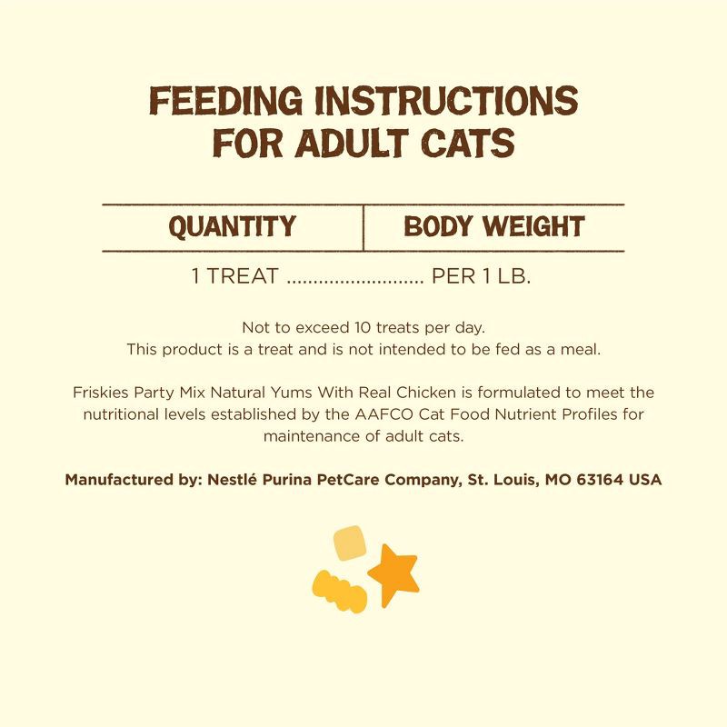 - Friskies Party Mix cat treats designed for adult cats feature a tasty crunch and fun shapes to keep your cat interested