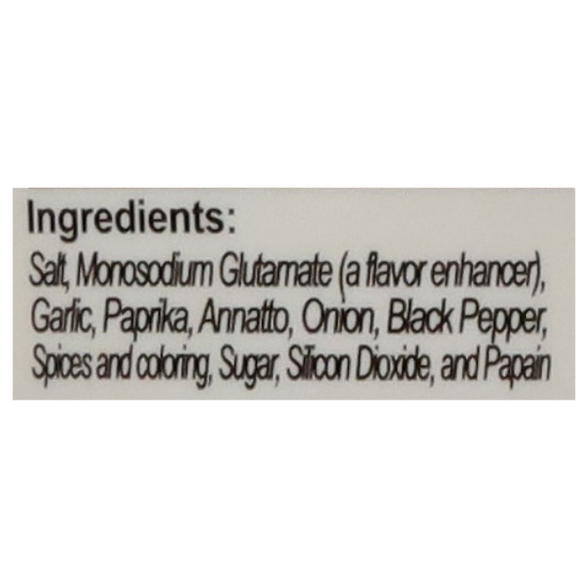 Salt, Monosodium Glutamate (a Flavor Enhancer), Garlic, Paprika, Annatto, Onion, Black Pepper, Spices and Coloring, Sugar, Silicon Dioxide, and Papain.