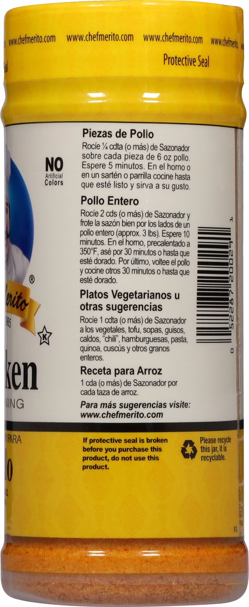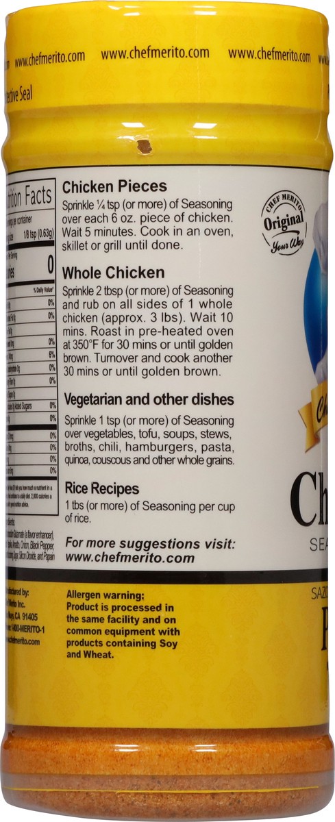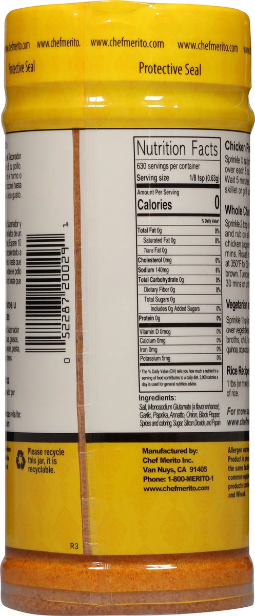 Chef Merito. Since 1985. No carbs. For more suggestions visit www.chefmerito.com. Please recycle this jar, it is recyclable. If you are sensitive to MSG, try our No MSG products. This product enhances…