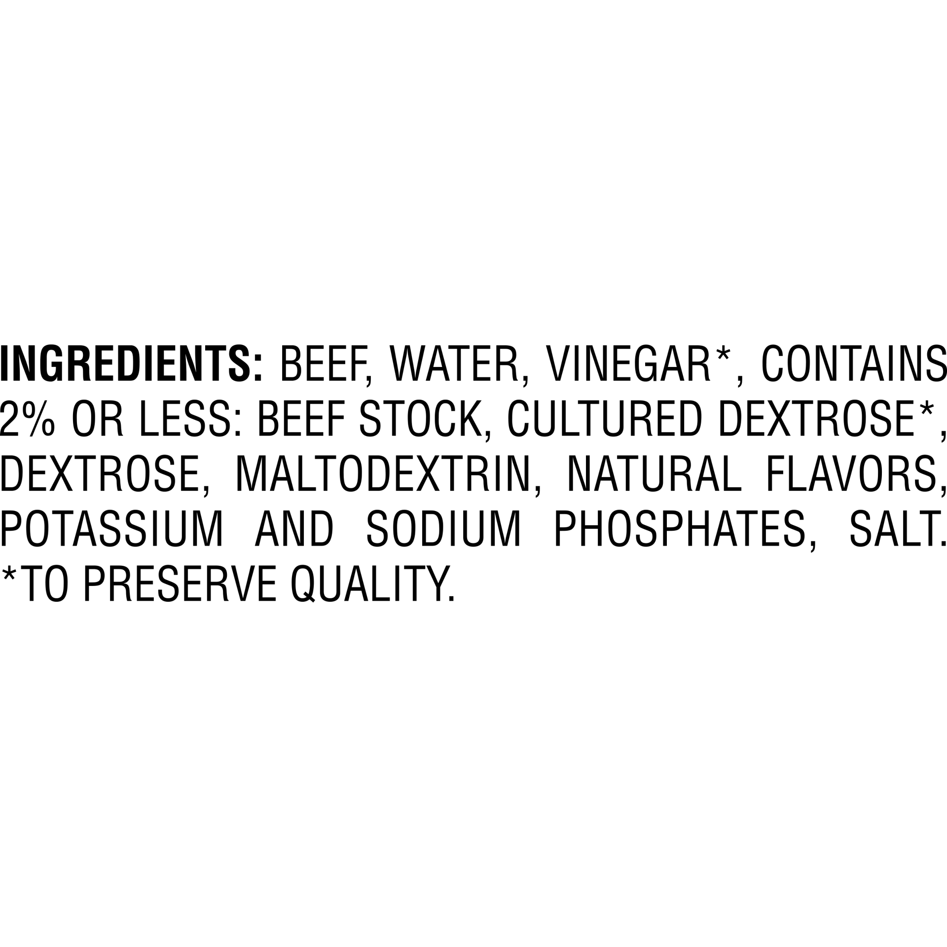 Beef, water, vinegar*, Contains 2% or less: beef stock, cultured dextrose*, dextrose, maltodextrin, natural flavors, potassium and sodium phosphates, salt. *To preserve quality.