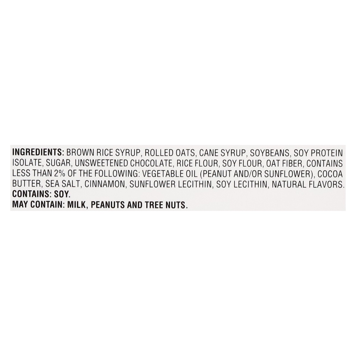 Brown Rice Syrup, Rolled Oats, Cane Syrup, Soybeans, Soy Protein Isolate, Sugar, Unsweetened Chocolate, Rice Flour, Soy Flour, Oat Fiber, Contains Less than 2% of the Following: Vegetable Oil (Peanut …