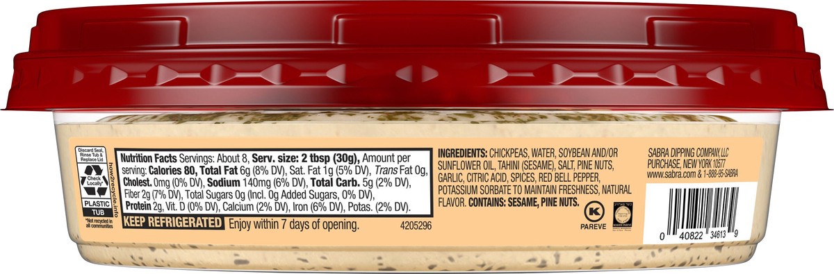 Chickpeas, Water, Soybean and/or Sunflower Oil, Tahini (Sesame), Salt, Pine Nuts, Garlic, Citric Acid, Spices, Red Bell Pepper, Potassium Sorbate to Maintain Freshness, Natural Flavor.