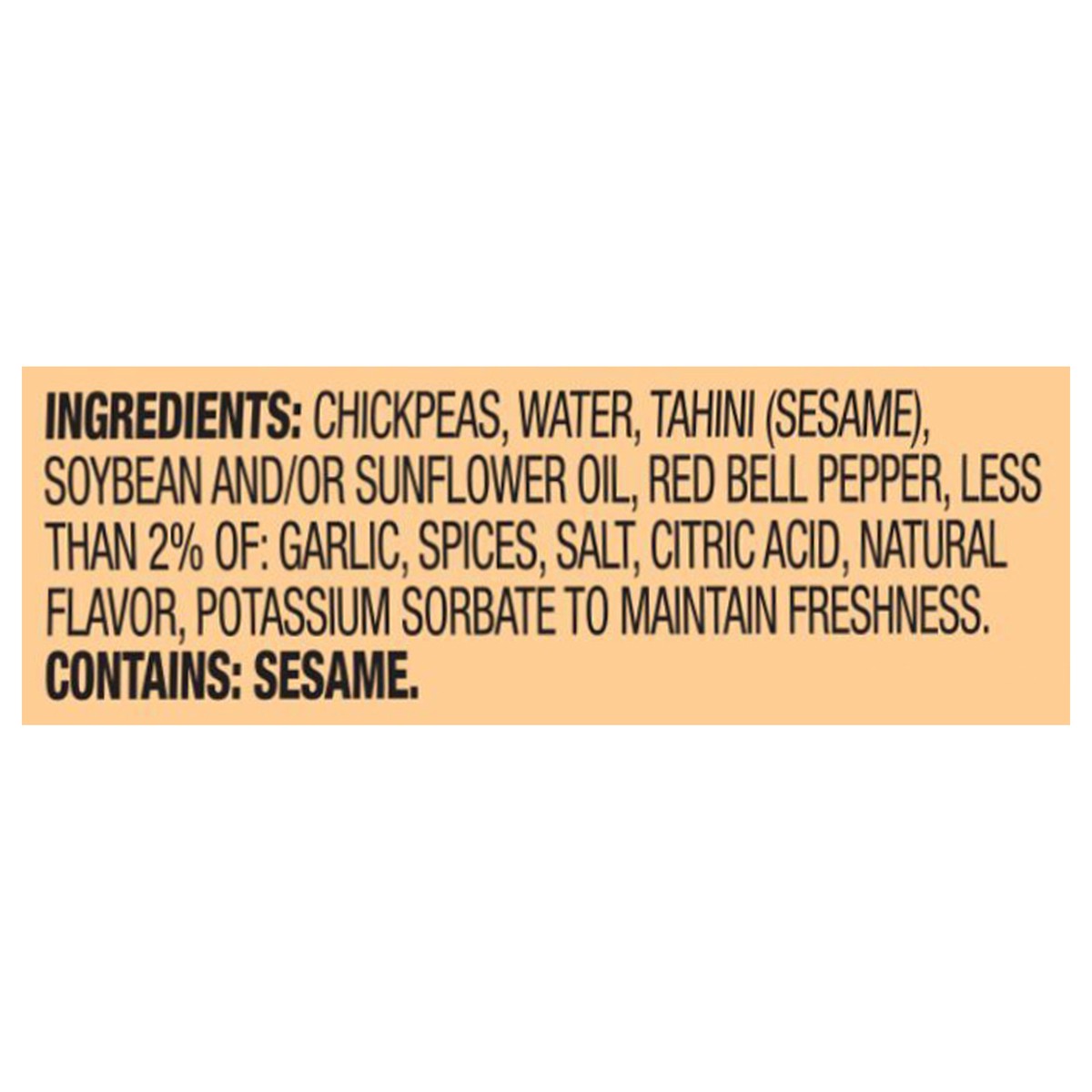 Chickpeas, Water, Tahini (Sesame), Soybean and/or Sunflower Oil, Red Bell Pepper, Less than 2% of: Garlic, Spices, Salt, Citric Acid, Natural Flavor, Potassium Sorbate to Maintain Freshness.