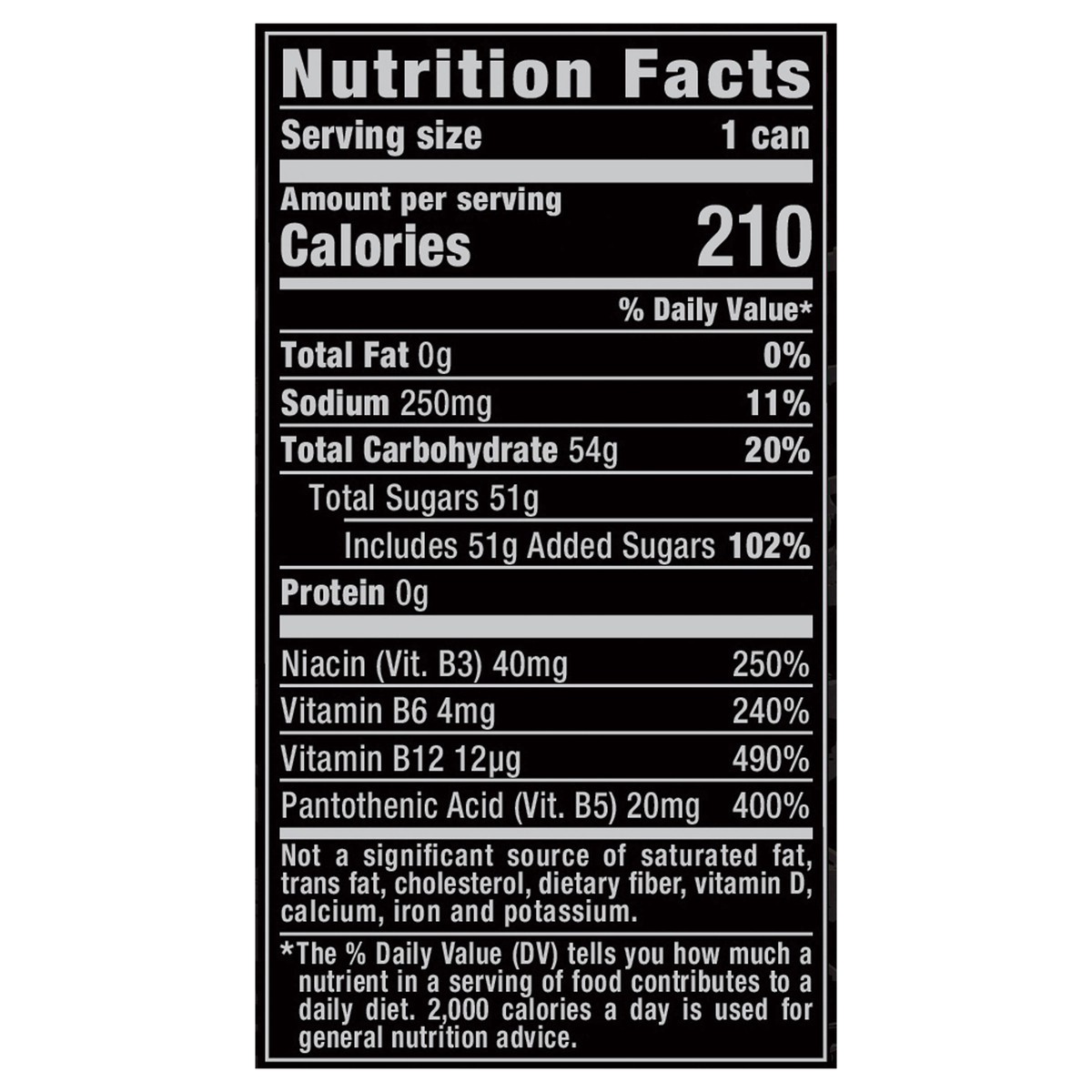Carbonated Water, Sugar, Glucose, Citric Acid, Taurine, Sodium Citrate, Natural Flavors, Panax Ginseng Flavor, Sodium Benzoate (Preservative), L-Carnitine L-Tartrate, Caffeine, Potassium Sorbate (Pres…