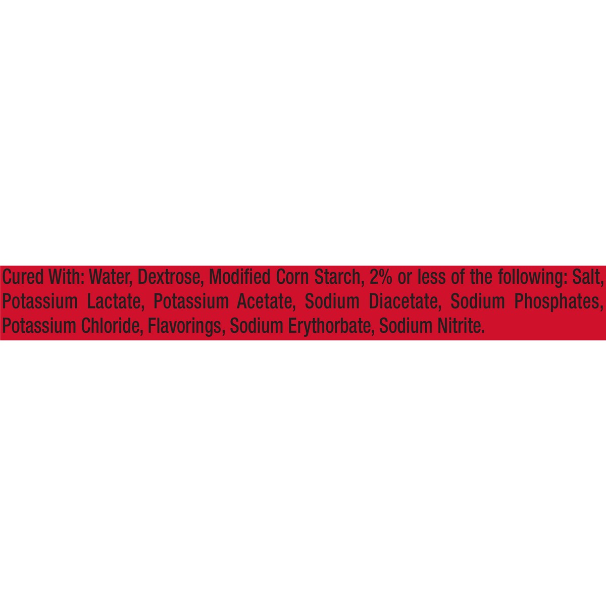 Cured With: Water, Dextrose, Modified Corn Starch, 2% or less of the following: Salt, Potassium Lactate, Potassium Acetate, Sodium Diacetate, Sodium Phosphates, Potassium Chloride, Flavorings, Sodium …