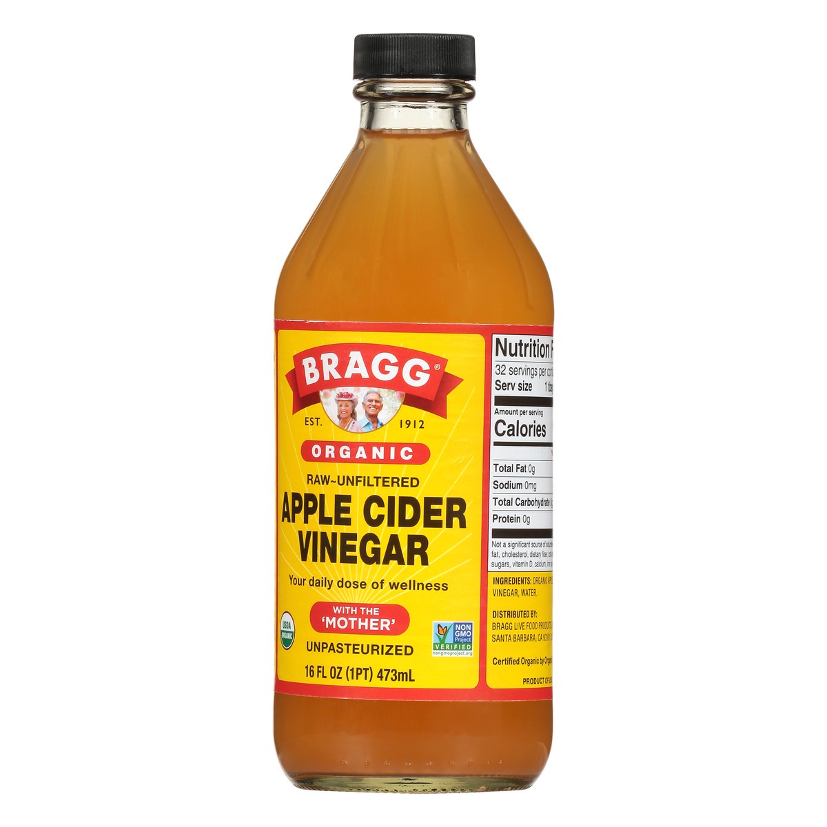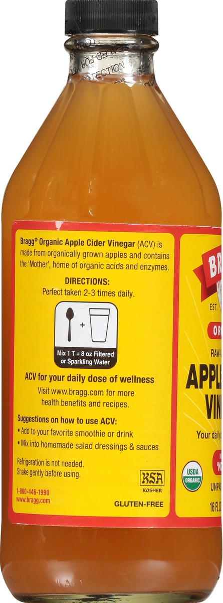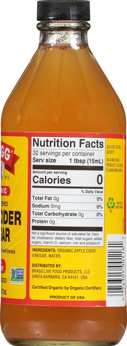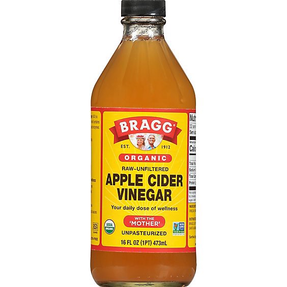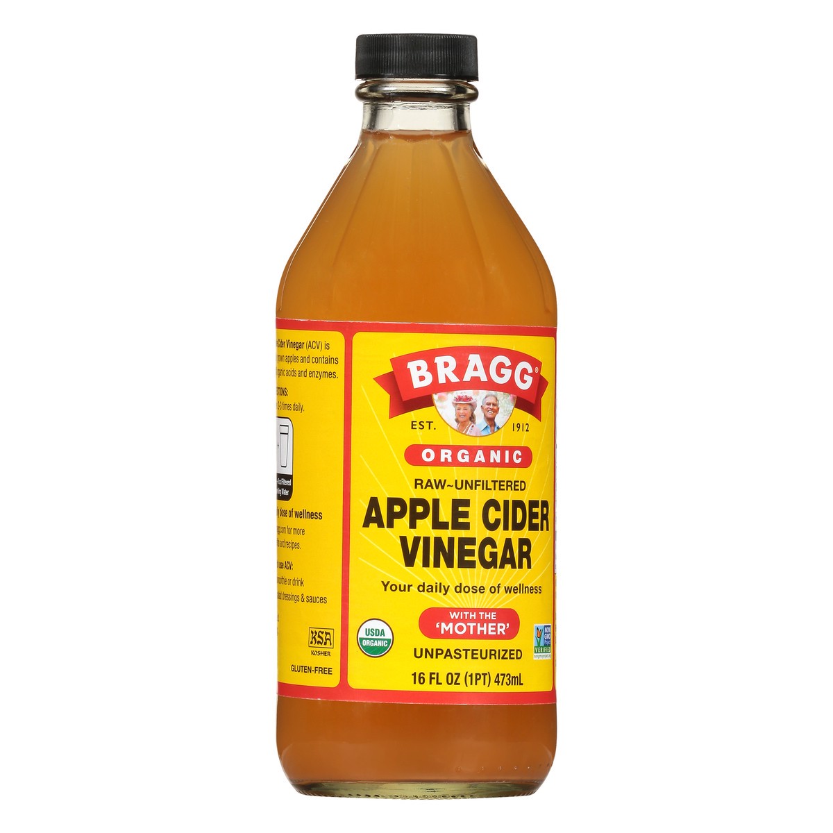 USDA Organic. Certified Organic by Organic Certifiers. Gluten free. Non GMO Project verified. nongmoproject.org. Est. 1912. Raw-unfiltered. With the mother. Unpasteurized. Bragg Organic Apple Cider Vi…