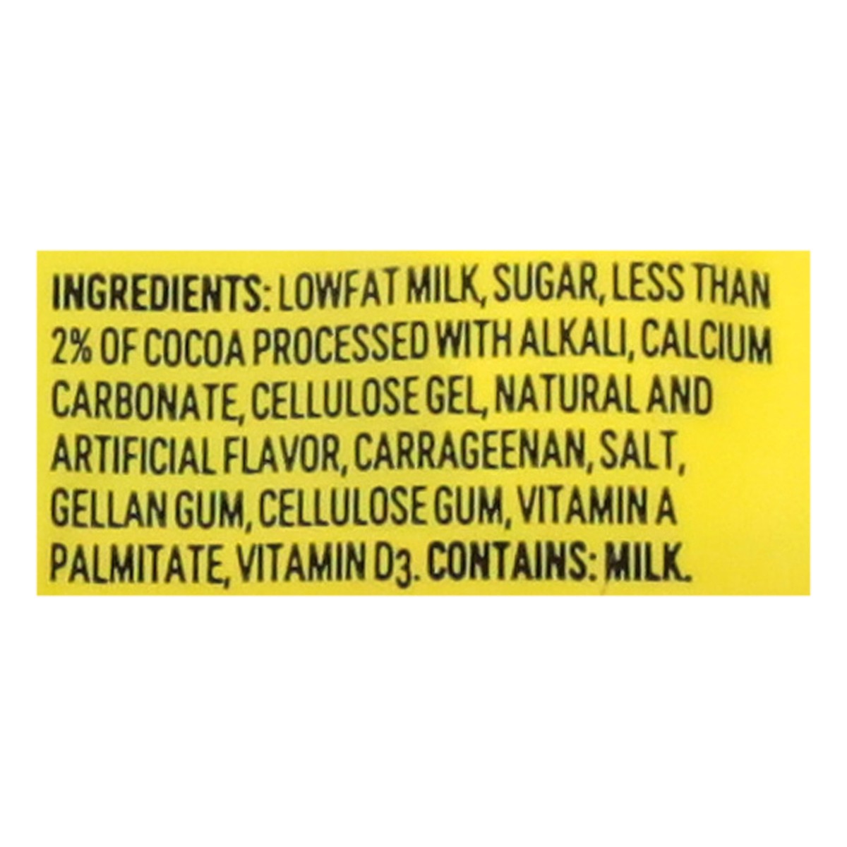 Lowfat Milk, Sugar, Less than 2% of Cocoa Processed with Alkali, Calcium Carbonate, Cellulose Gel, Natural and Artificial Flavor, Carrageenan, Salt, Gellan Gum, Cellulose Gum, Vitamin A Palmitate, Vit…