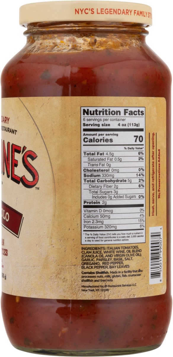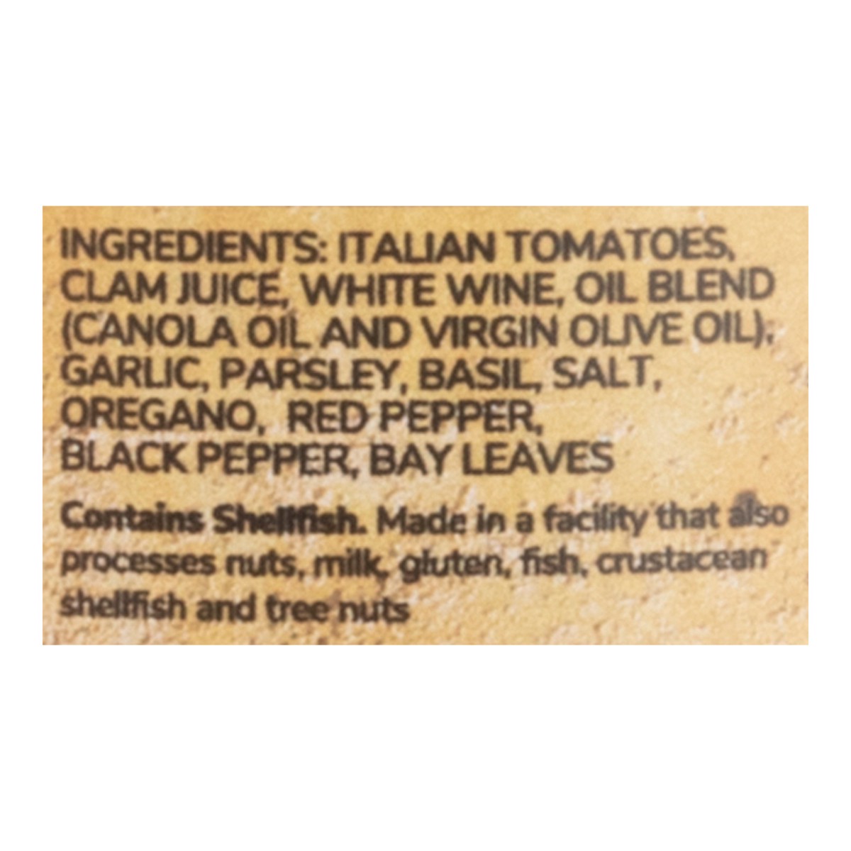 Italian Tomatoes, Clam Juice, White Wine, Oil Blend (Canola Oil and Virgin Olive Oil); Garlic, Parsley, Basil, Salt, Oregano, Red Pepper, Black Pepper, Bay Leaves.