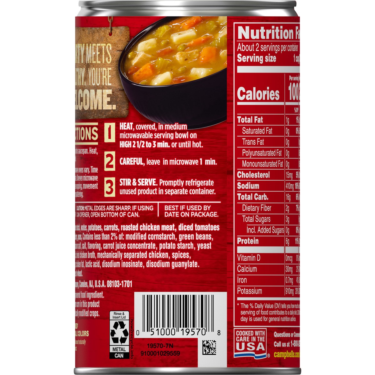 INGREDIENTS: CHICKEN STOCK, WATER, POTATOES, CARROTS, ROASTED CHICKEN MEAT, DICED TOMATOES IN TOMATO JUICE, CELERY, PEAS, CONTAINS LESS THAN 2% OF: MODIFIED CORNSTARCH, GREEN BEANS, DRIED ONIONS, POTA…