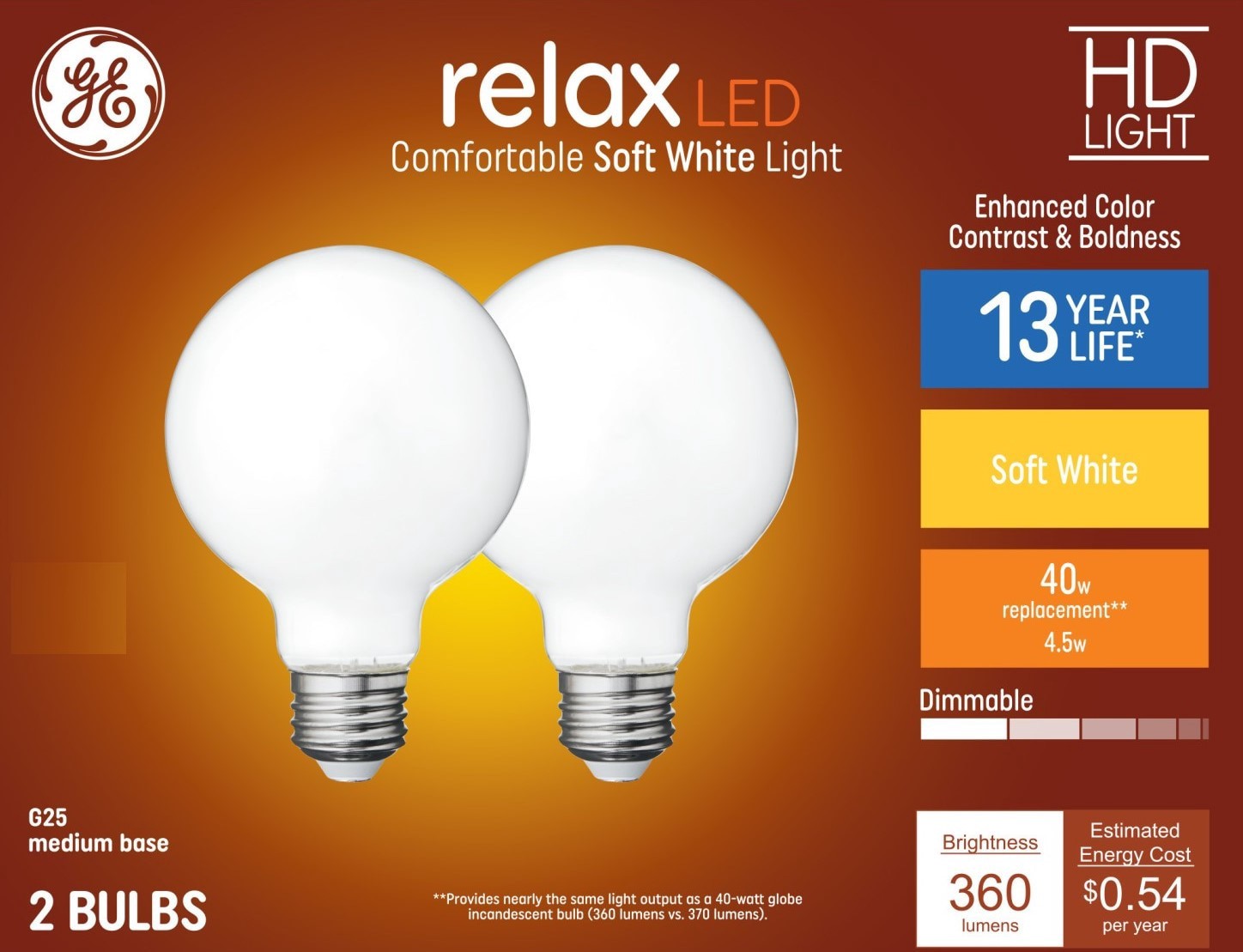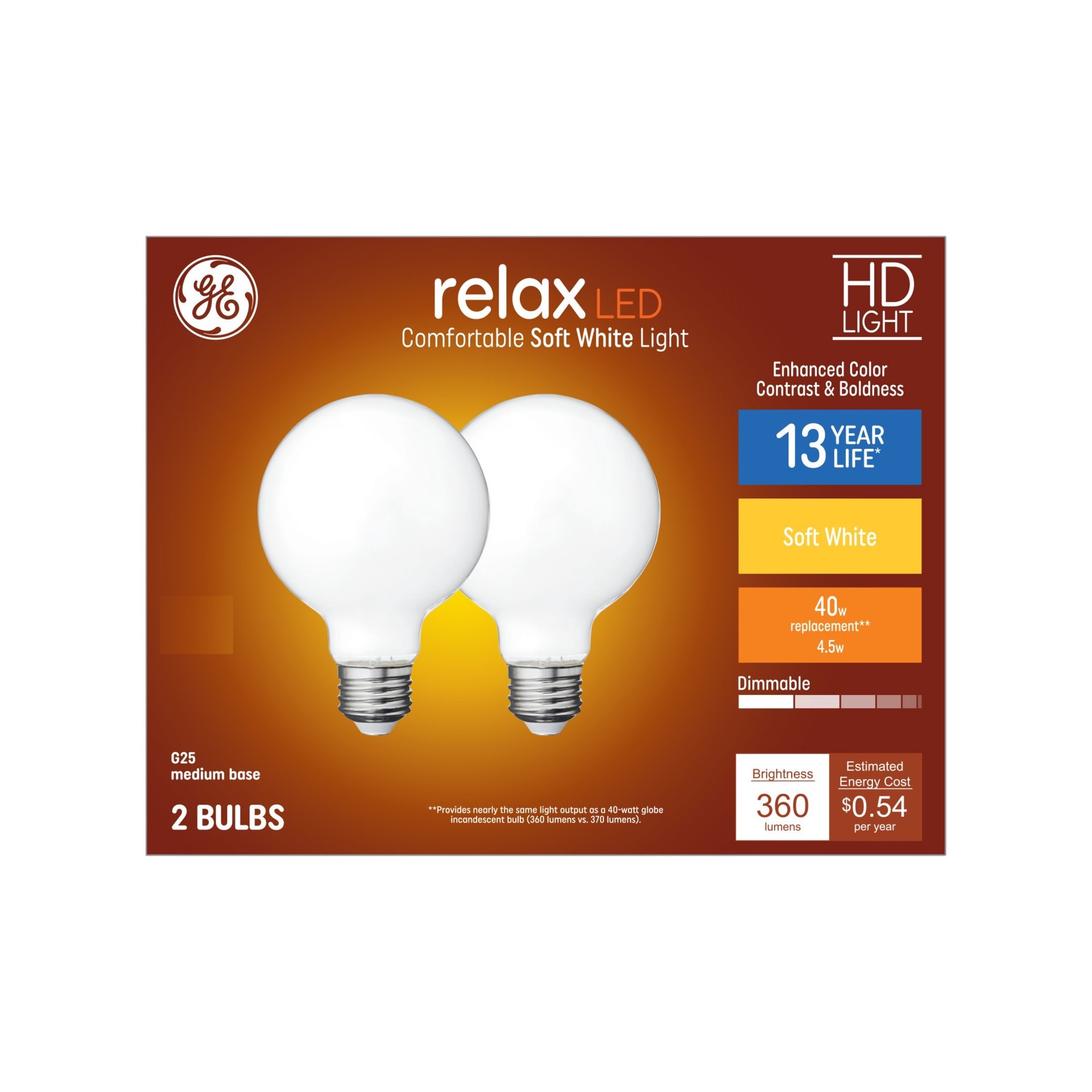 GE Relax HD 40 -Watt EQ G25 Soft white Medium screw base E26 Dimmable LED Decorative Light Bulb 2 -Pack