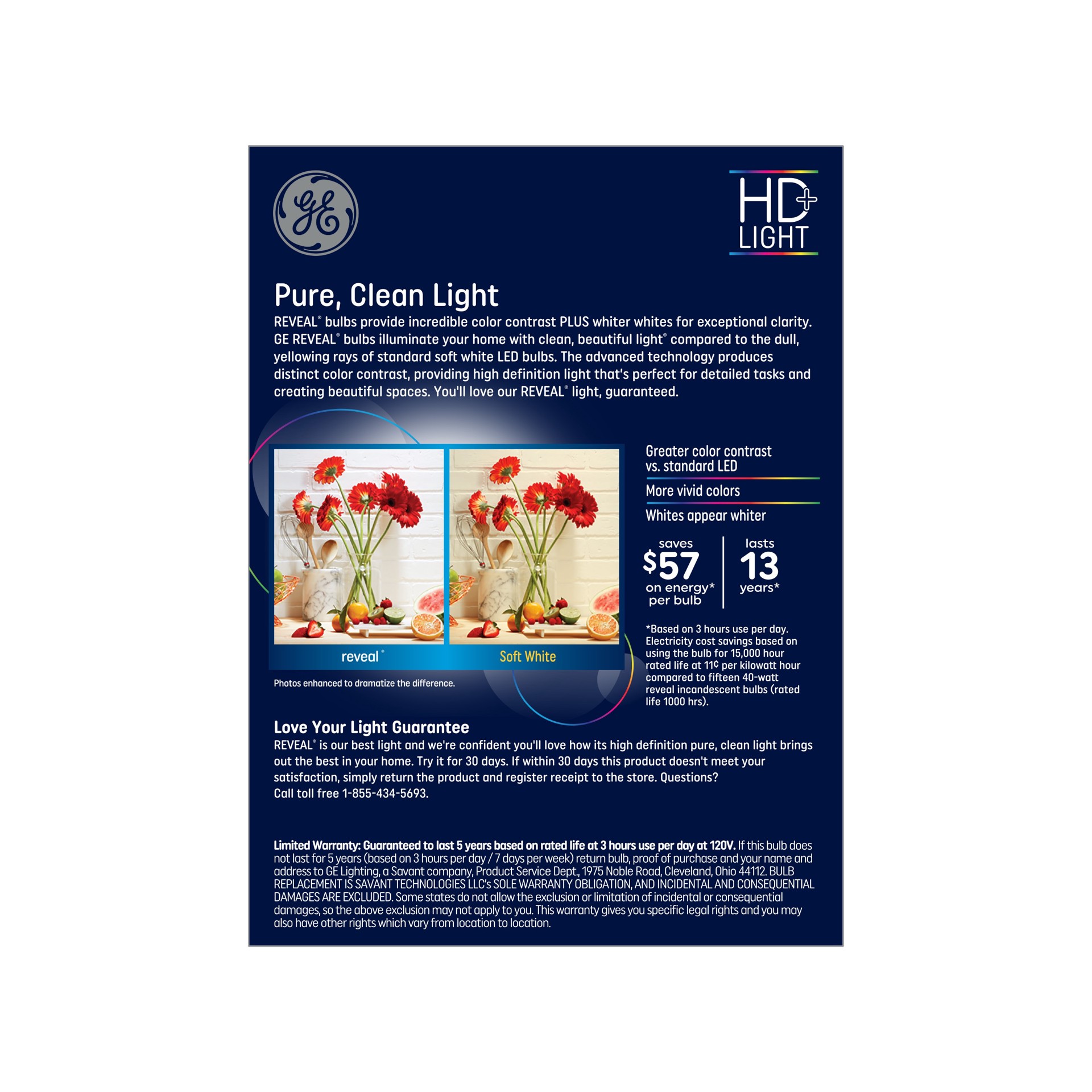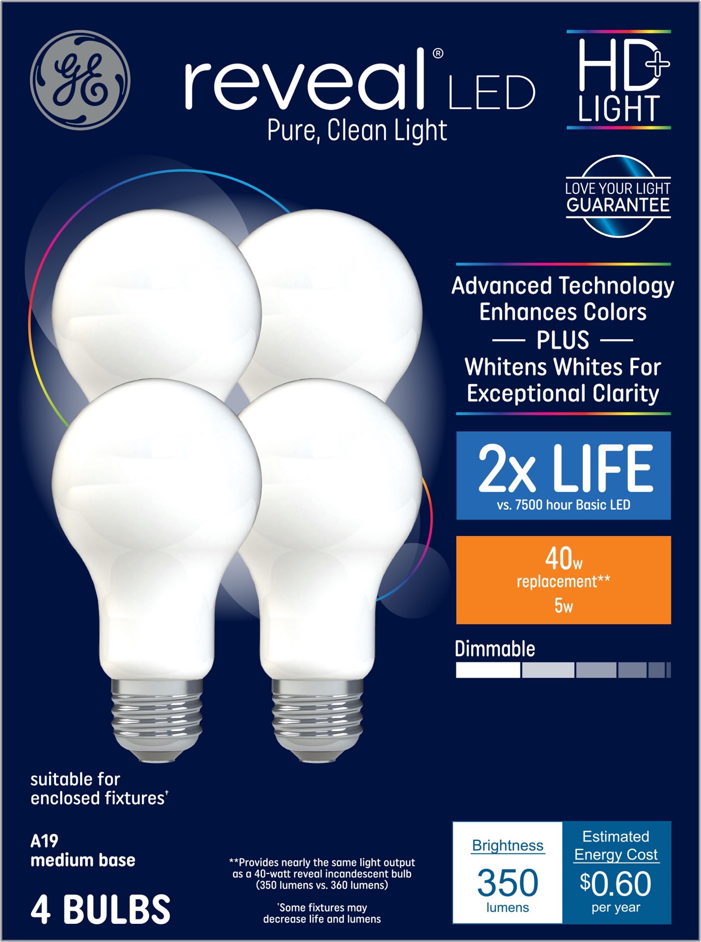 GE Reveal HD 40 -Watt EQ A19 Color-enhancing Medium screw base E26 Dimmable LED General purpose Light Bulb 4 -Pack