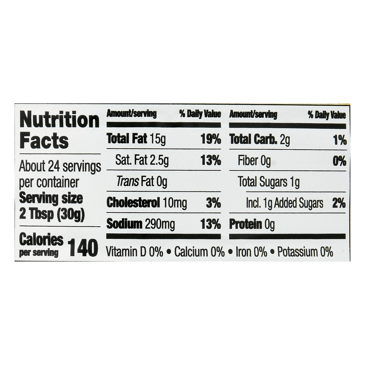 Soybean Oil, Water, Sugar, Egg Yolk, Distilled Vinegar, Buttermilk Solids, Salt, Contains Less than 2% of Monosodium Glutamate, Garlic (Dried), Phosphoric Acid, Onion (Dried), Xanthan Gum, Sorbic Acid…