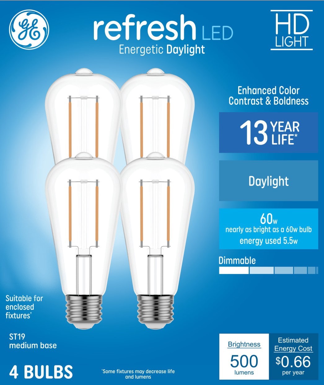 GE Refresh HD 60 -Watt EQ ST19 Daylight Medium screw base E26 Dimmable LED Decorative Light Bulb 4 -Pack