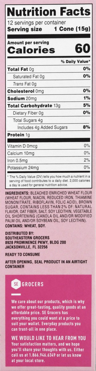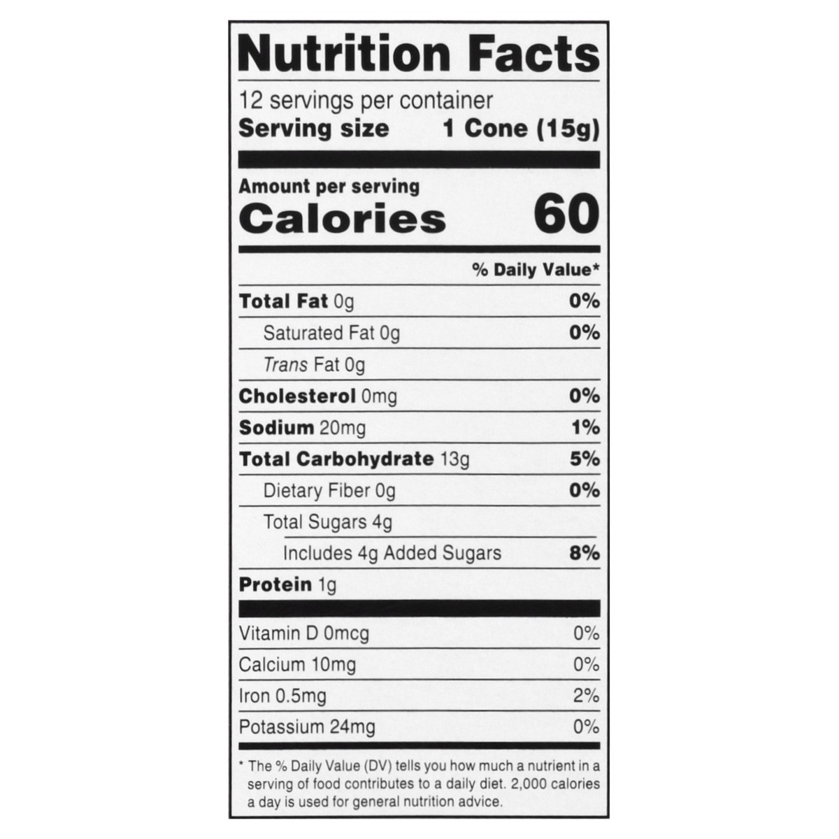 Per 1 Cone: 60 calories; 0 g sat fat (0% DV); 20 mg sodium (1% DV); 4 g total sugars. No artificial flavors or colors. SE Grocers: We care about our products, which is why we offer great - tasting, qu…