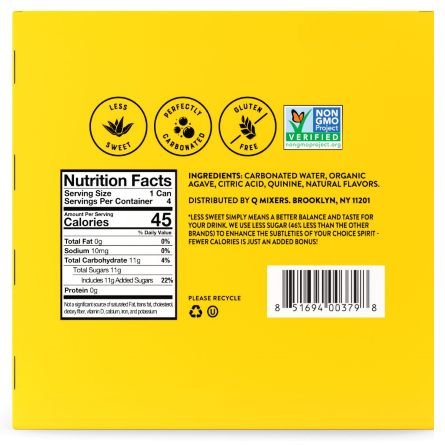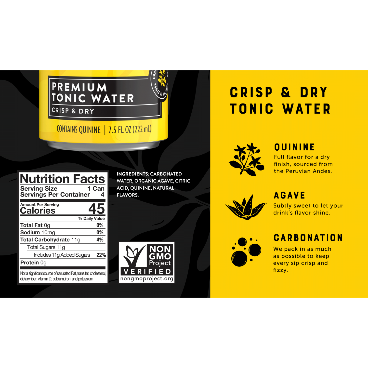Carbonated Water, Organic Agave, Citric Acid, Quinine, Natural Flavors.
