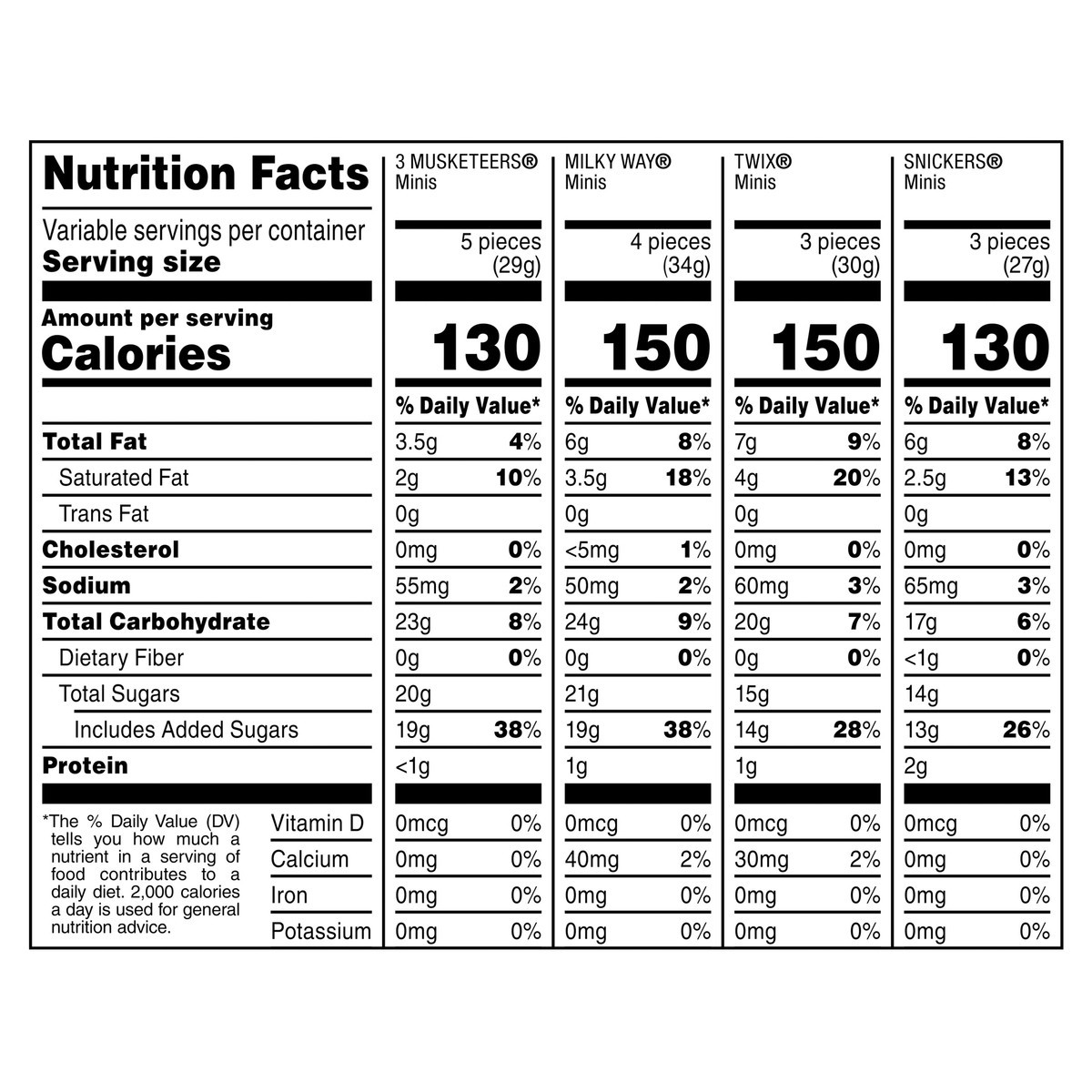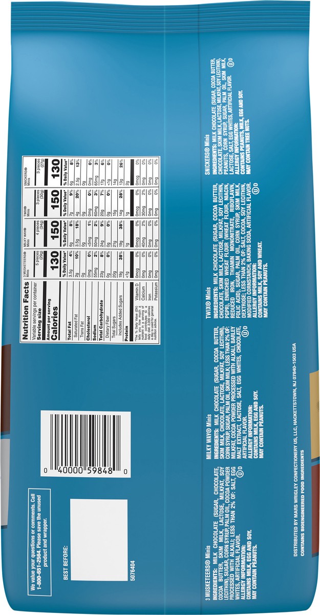 3 musketeers minis: allergy information: contains milk, egg and soy. may contain peanuts.,milky way minis: allergy information: contains milk, egg and soy. may contain peanuts.,twix minis: allergy information: contains milk, soy and wheat. may contain peanuts.,snickers minis: allergy information: contains peanuts, milk, egg and soy. may contain tree nuts.