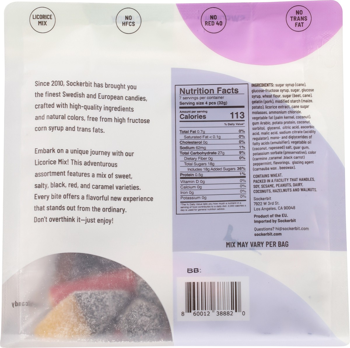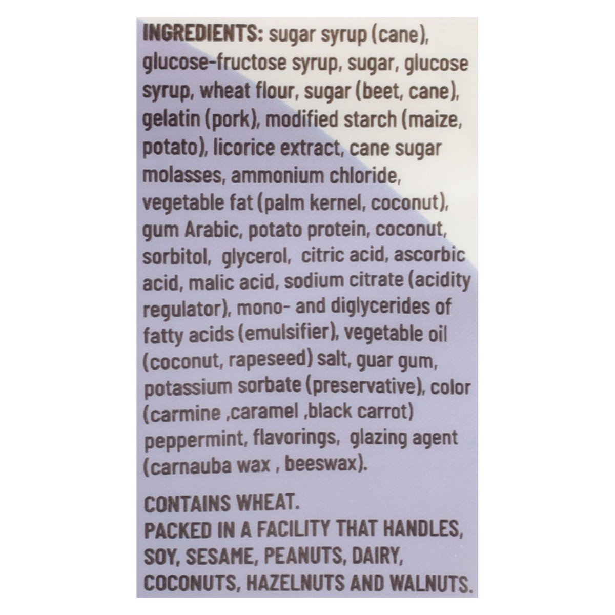 Sugar Syrup (Cane), Glucose-Fructose Syrup, Sugar, Glucose Syrup, Wheat Flour, Sugar (Beet, Cane), Gelatin (Pork), Modified Starch (Maize, Potato), Licorice Extract, Cane Sugar Molasses, Ammonium Chlo…