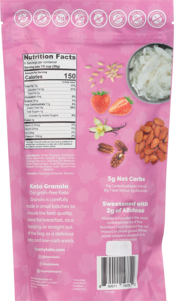 Dried Coconut, Sunflower Seeds, Almonds, Soluble Tapioca Fiber, Allulose, Pecans, Coconut Oil, Medium Chain Triglycerides, Dried Strawberries, Natural Vanilla Flavor, Salt, Monk Fruit Extract.