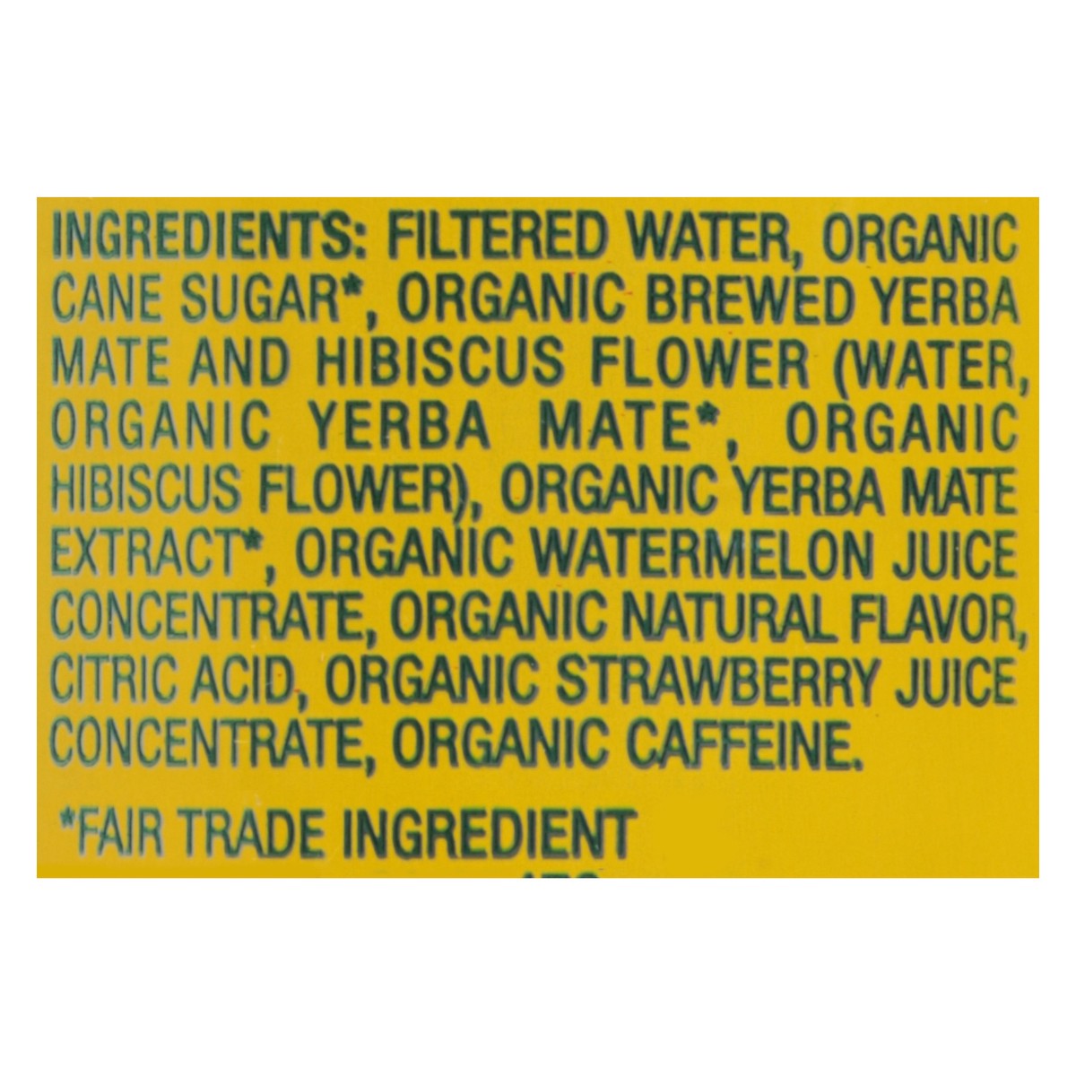 Filtered Water, Organic Cane Sugar*, Organic Brewed Yerba Mate and Hibiscus Flower (Water, Organic Yerba Mate*, Organic Hibiscus Flower), Organic Yerba Mate Extract*, Organic Watermelon Juice Concentr…