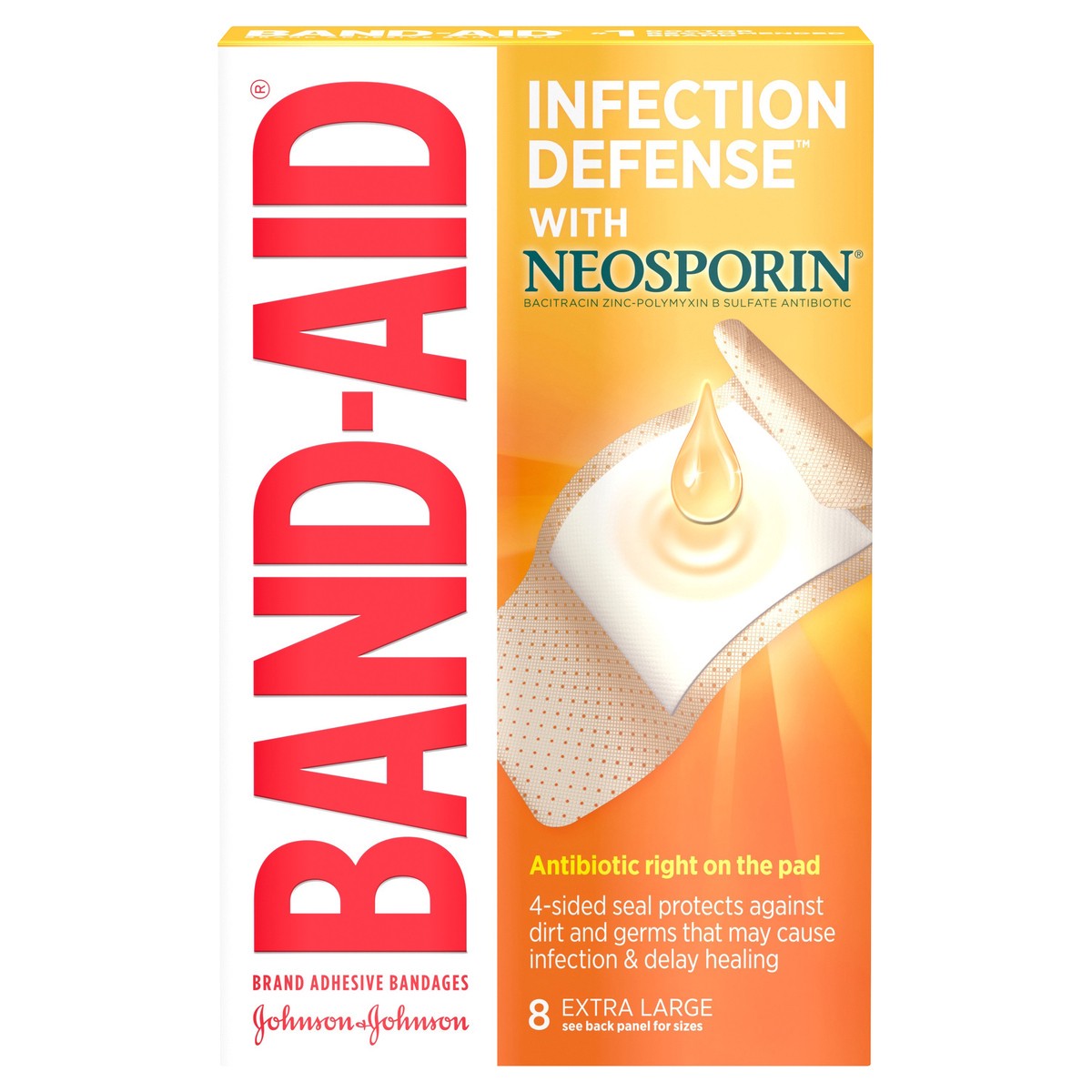 Band-Aid Brand Adhesive Bandages Infection Defense with Neosporin Antibiotic Ointment, for Wound Care and First Aid, Extra Large, 8 ct