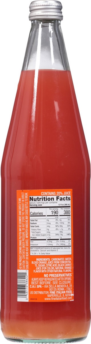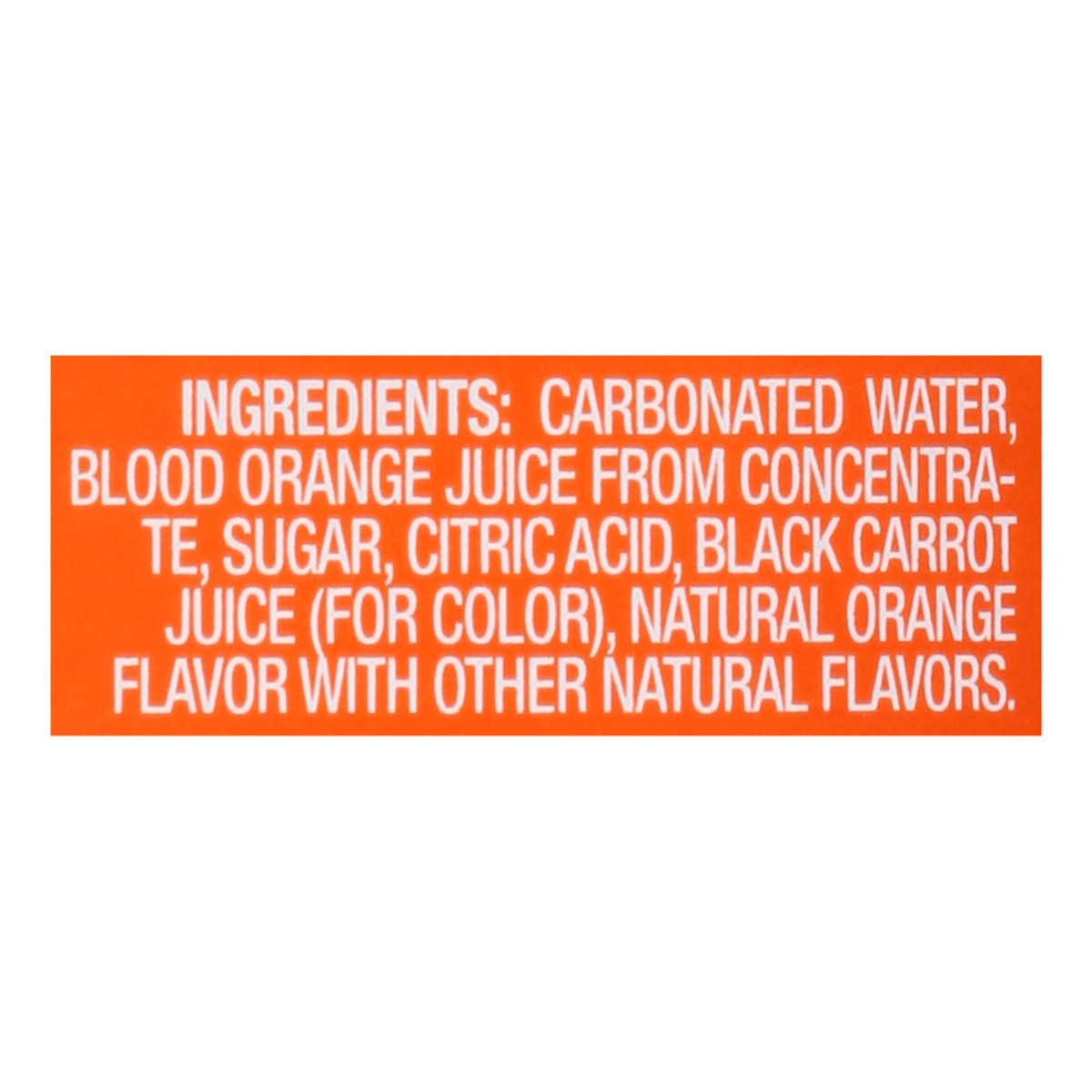 Carbonated Water, Blood Orange Juice from Concentrate, Sugar, Citric Acid, Black Carrot Juice (for Color), Natural Orange Flavor with Other Natural Flavors.