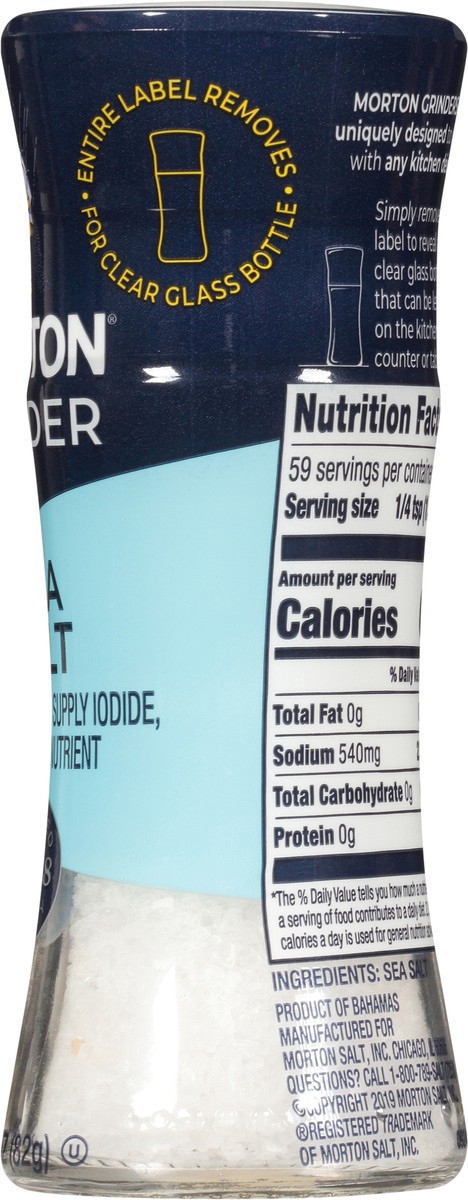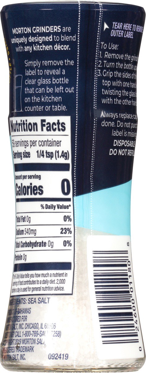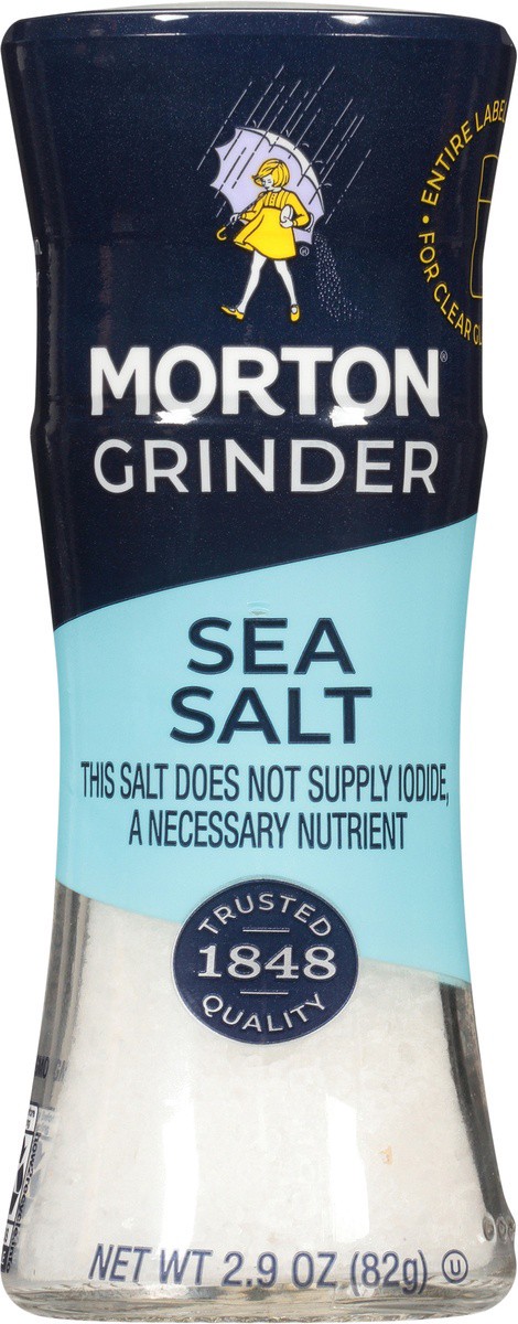 1848 trusted quality. This salt does not supply iodide, a necessary nutrient. Entire label removes. For clear glass bottle. Morton Grinders are uniquely designed to blend with any kitchen decor. www.m…