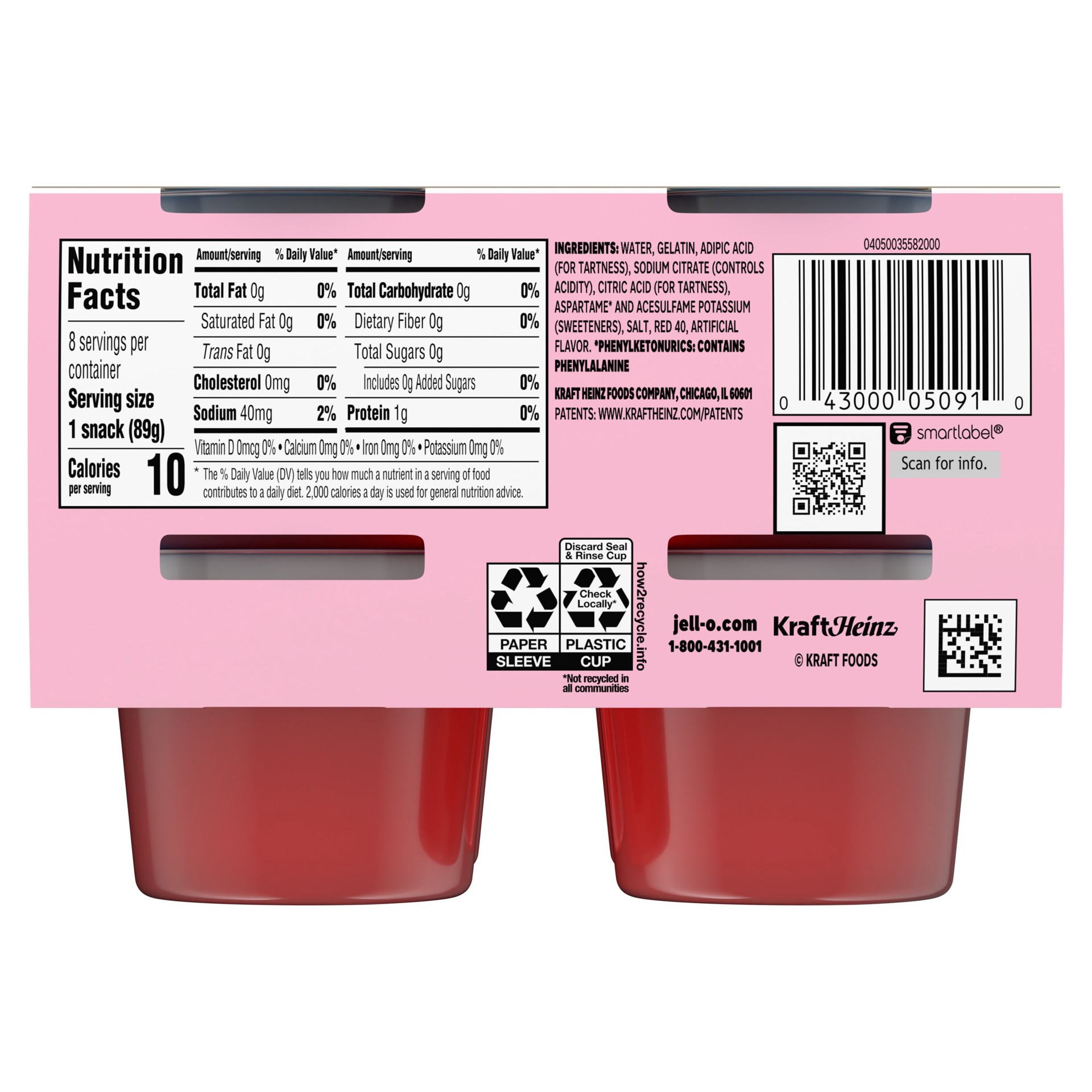 Water, Gelatin, Adipic Acid (for Tartness), Sodium Citrate (Controls Acidity), Citric Acid (for Tartness), Aspartame* and Acesulfame Potassium (Sweeteners), Salt, Red 40, Artificial Flavor. * Phenylke…