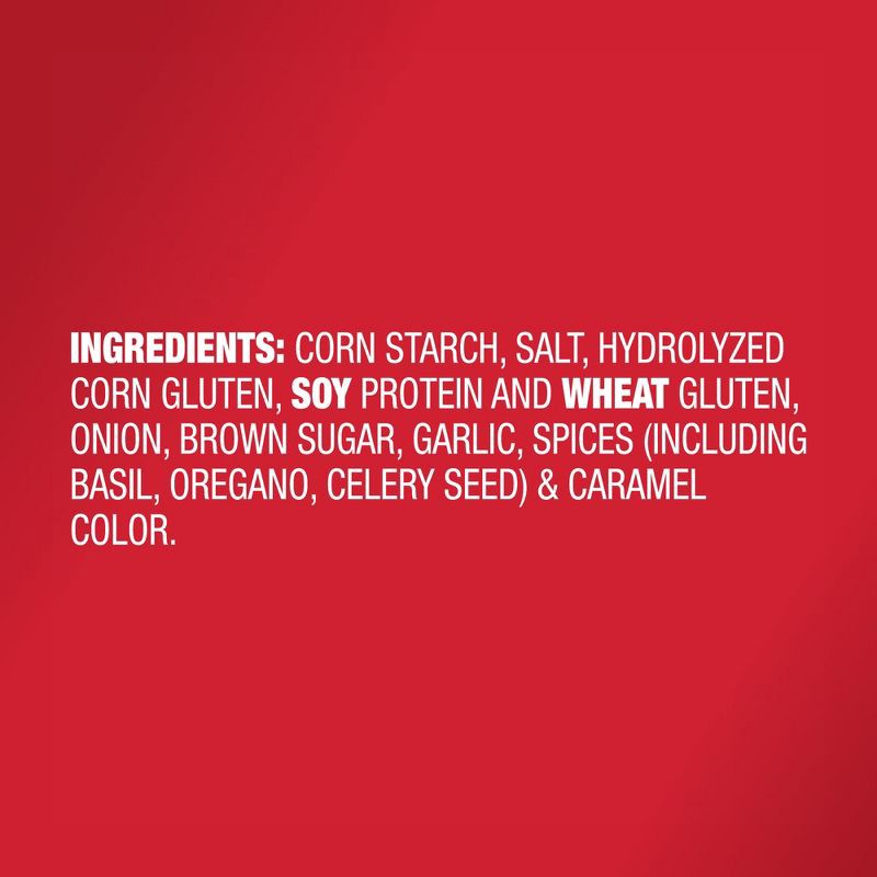 Corn Starch, Salt, Hydrolyzed Corn Gluten, Soy Protein and Wheat Gluten, Onion, Brown Sugar, Garlic, Spices (Including Basil, Oregano, Celery Seed), Caramel Color