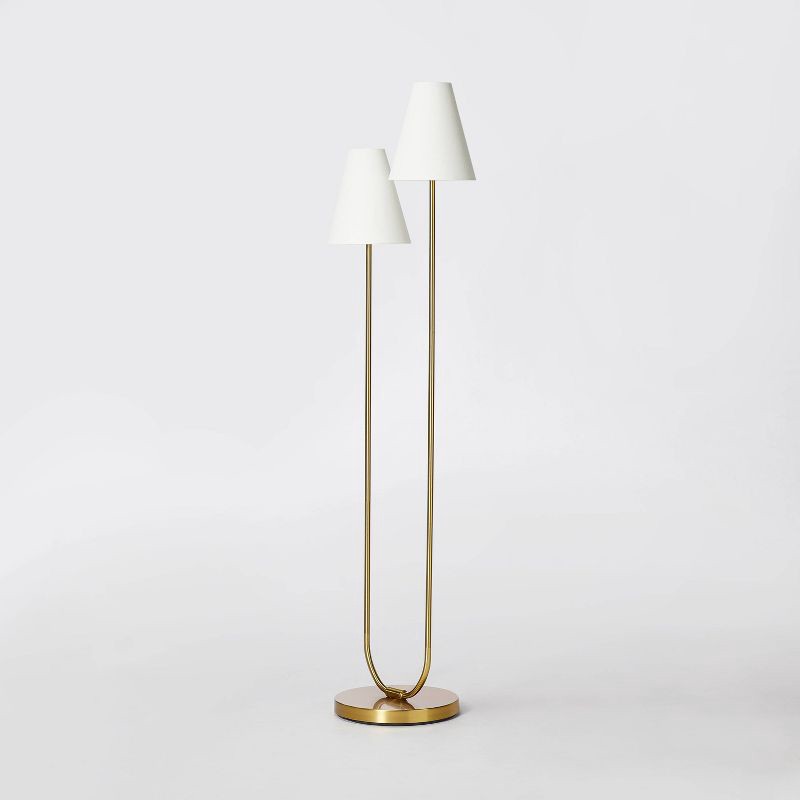 Transform the ambience of any room with this 2-Head Floor Lamp Brass from Threshold designed with Studio McGee. This two-head floor lamp brings a unique minimalist look to your indoor lighting and eas…