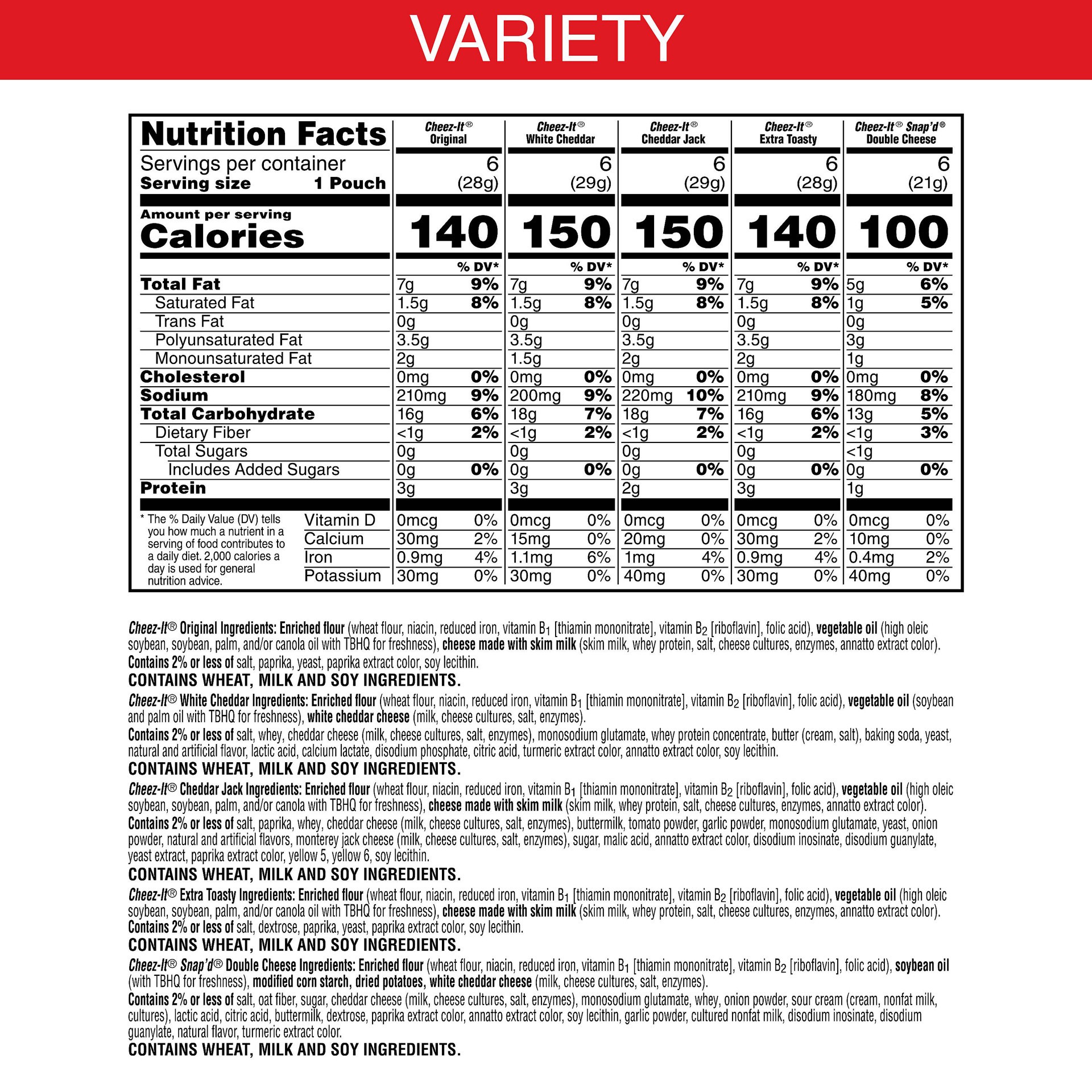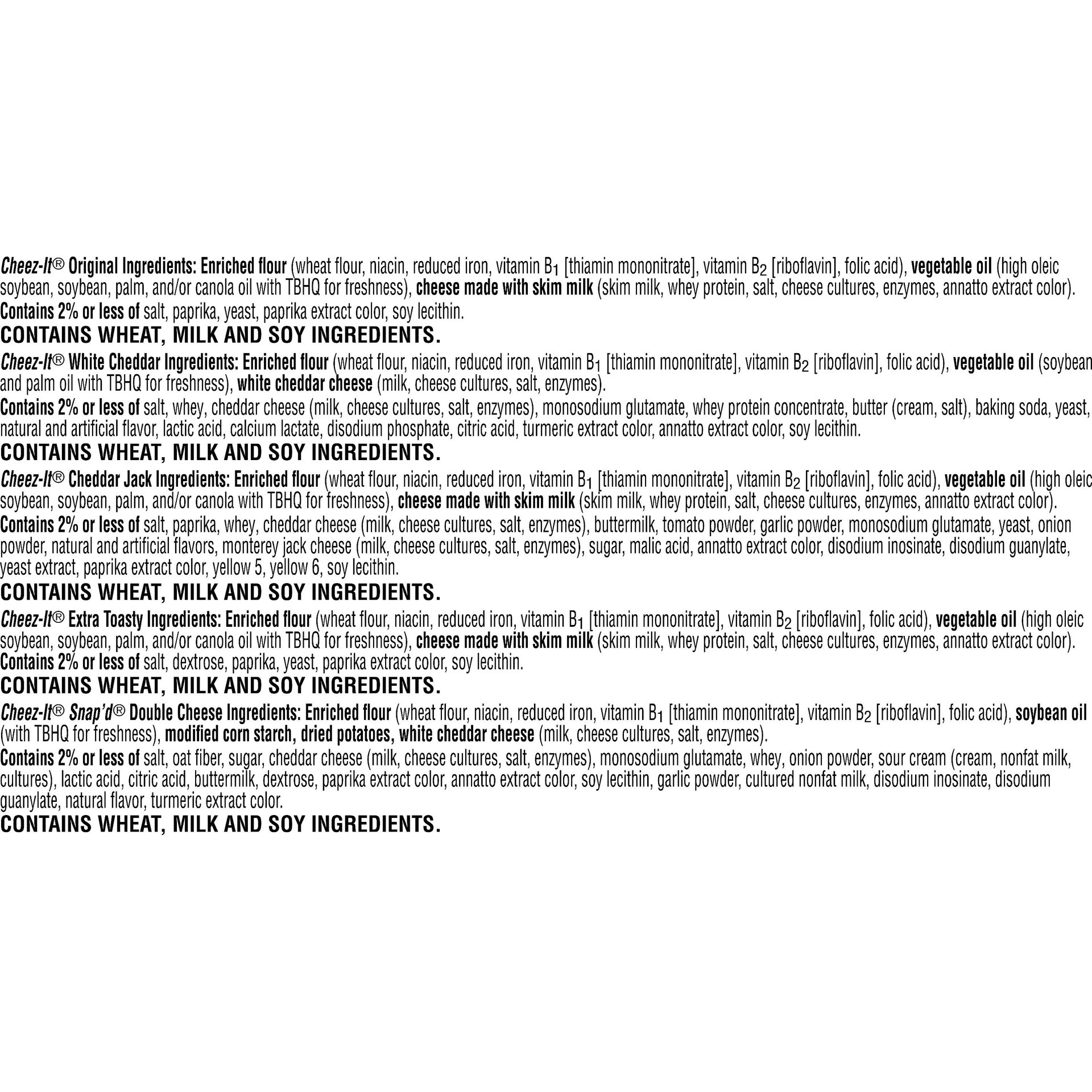 Cheez-It Original : Enriched Flour (Wheat Flour, Niacin, Reduced Iron, Vitamin B1 [Thiamin Mononitrate], Vitamin B2 [Riboflavin], Folic Acid), Vegetable Oil (High Oleic Soybean, Soybean, Palm, and/or …