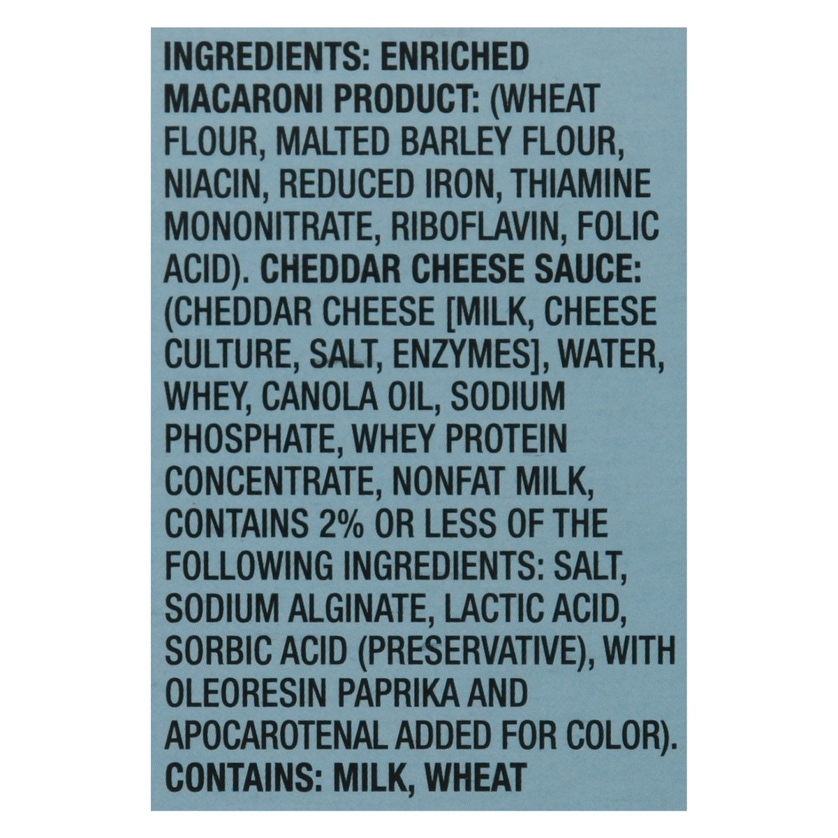 Enriched Macaroni Product: (Wheat Flour, Malted Barley Flour, Niacin, Reduced Iron, Thiamine Mononitrate, Riboflavin, Folic Acid), Cheddar Cheese Sauce: (Cheddar Cheese [Milk, Cheese Culture, Salt, En…